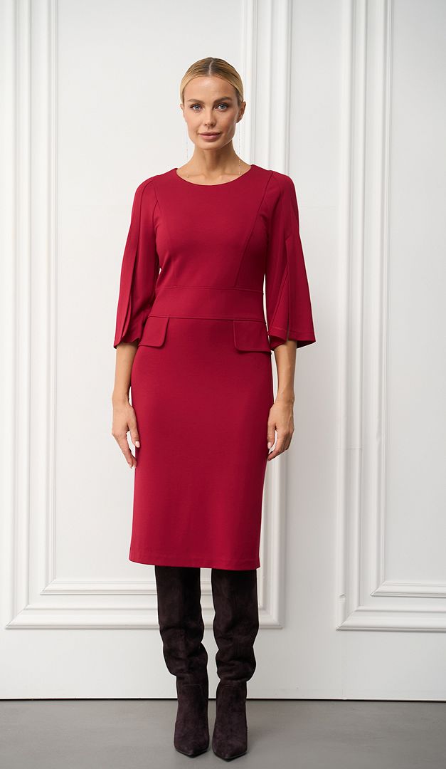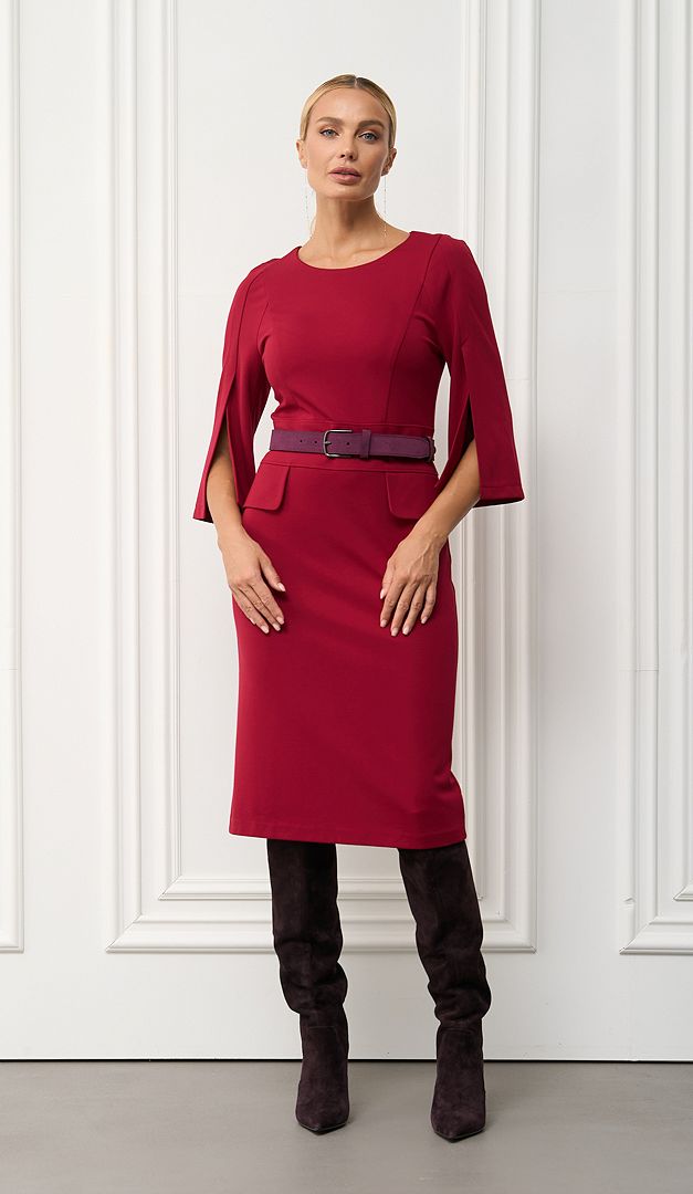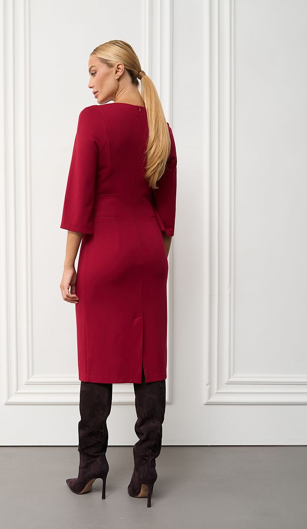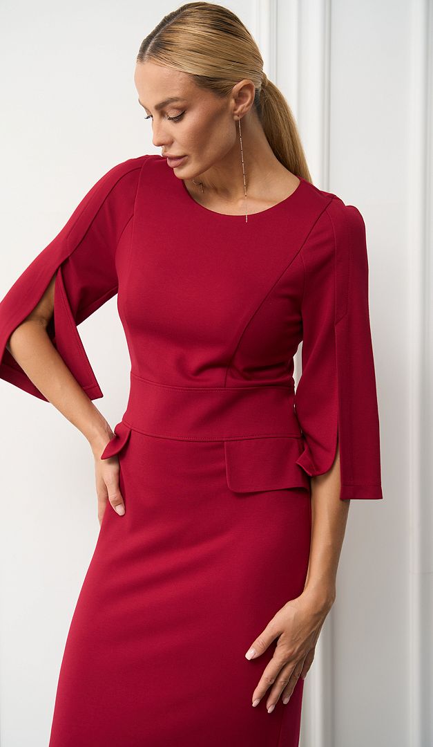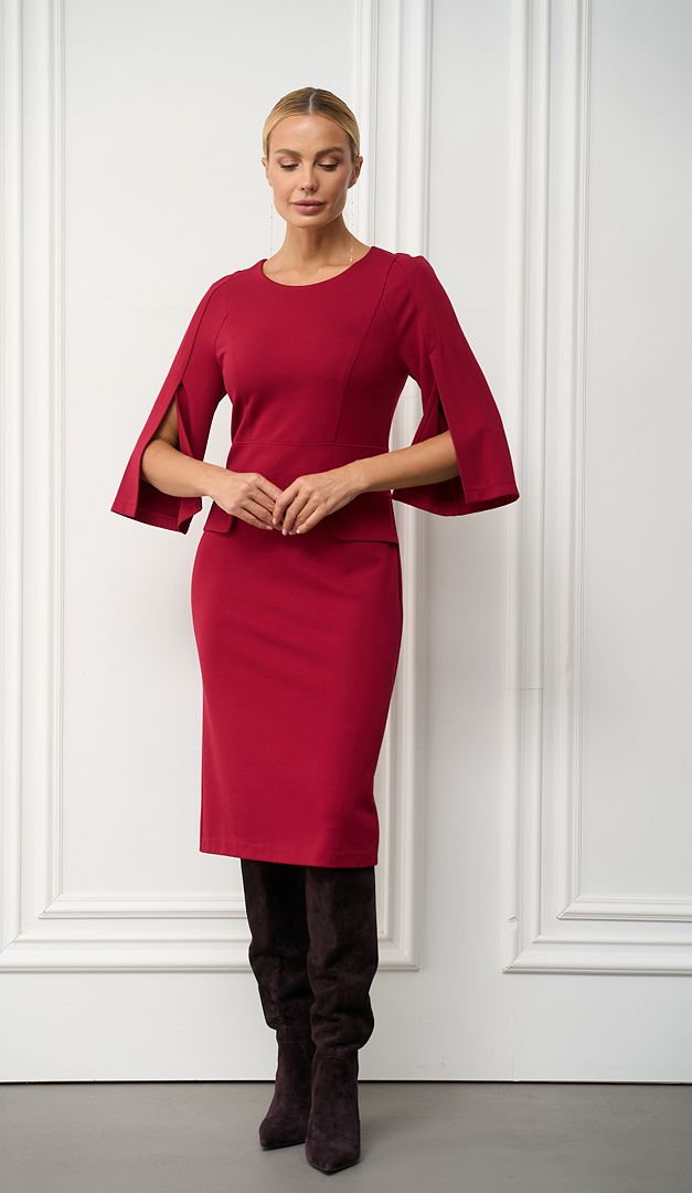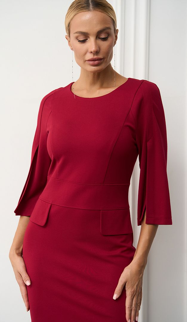 Класична сукня трикотажна з клапанами бордо з королівським шиком. Лаконічна приталена модель, яка кожну Вашу появу перетворить в справжній фурор! По відрізній лінії талії сукня прикрашена декоративними клапанами. А головною «родзинкою» виробу є шикарні укорочені рукава, що кокетливо відкривають лінію рук. В середньому шві задньої частини розташована довга застібка на «блискавку». Без підкладки.