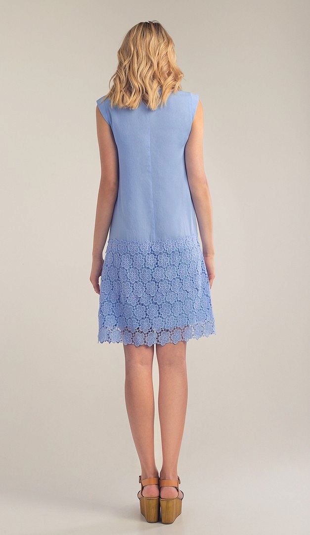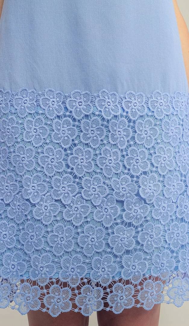 Легкий романтический сарафан с кружевом голубой — must-have для Вашего летнего гардероба! Прямой, слегка расширенный книзу крой специально созданный для абсолютно всех типов фигуры. Линия плеча прикрыта аккуратным «крылышком». Самое нежное и привлекательное в сарафане – это широкое ажурное кружево. Именно эта деталь сделает образ более кокетливым и нарядным!