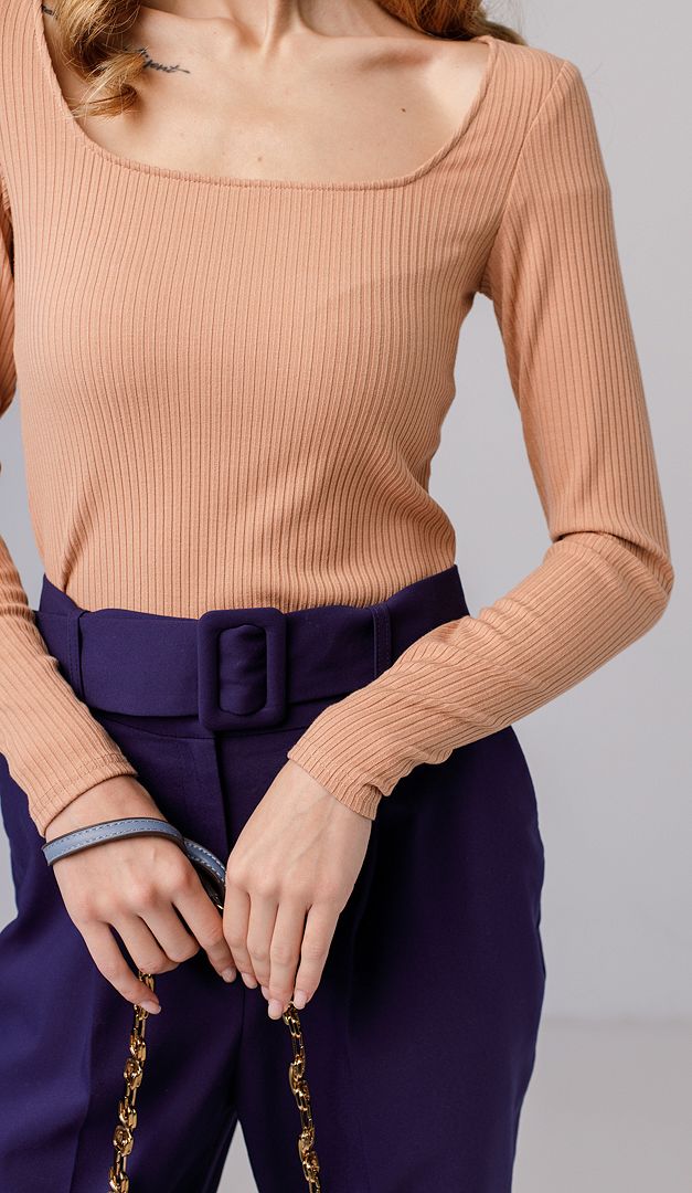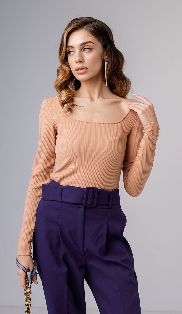 Топ с квадратным вырезом карамельный — это стильная и практичная основа для абсолютно любого образа! Изготовлен топ из эластичного трикотажа в тонкий рубчик. Топ имеет комфортный прилегающий крой. «Изюминка» этой базовой модели — открытый квадратный вырез, который подходит для всех типов фигуры.
