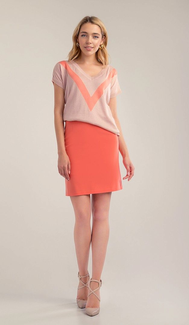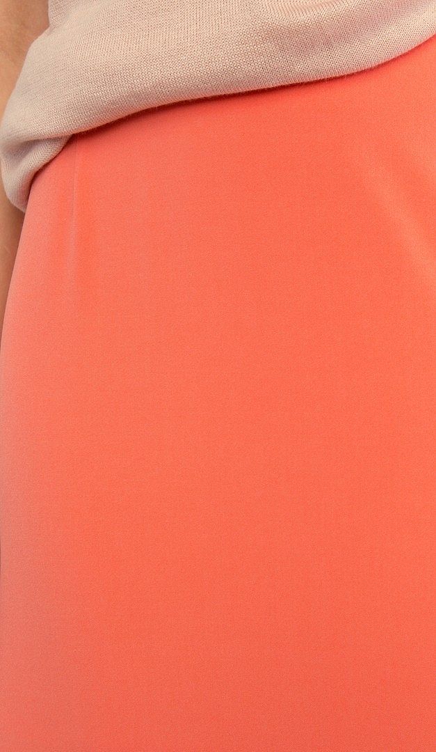 Ефектний літній варіант класичної спідниці. Лаконічний дизайн, мінімум деталей — це ідеальна спідниця для роботи та урочистих подій. Модель має прямий силует, злегка розширений до низу, і середню посадку по талії. Застібається на «блискавку» в середньому шві задньої частини. Виріб на тонкій підкладці з 100% бавовни.