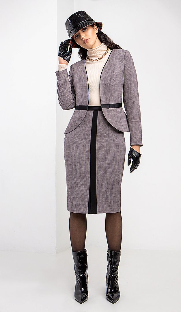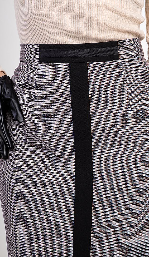Очень стильная классическая юбка-карандаш, которая по-новому раскроет деловой образ! Юбка Лурдес выполнена из меланжевой ткани с контрастными планками. Именно эти настроченные по центру юбки и пояса планки помогут сделать силуэт зрительно стройнее. Ещё одна оригинальная деталь юбки Лурдес — это небольшая распорка спереди. Застежка-«молния» находится в среднем шве заднего полотнища. Юбка на подкладке.