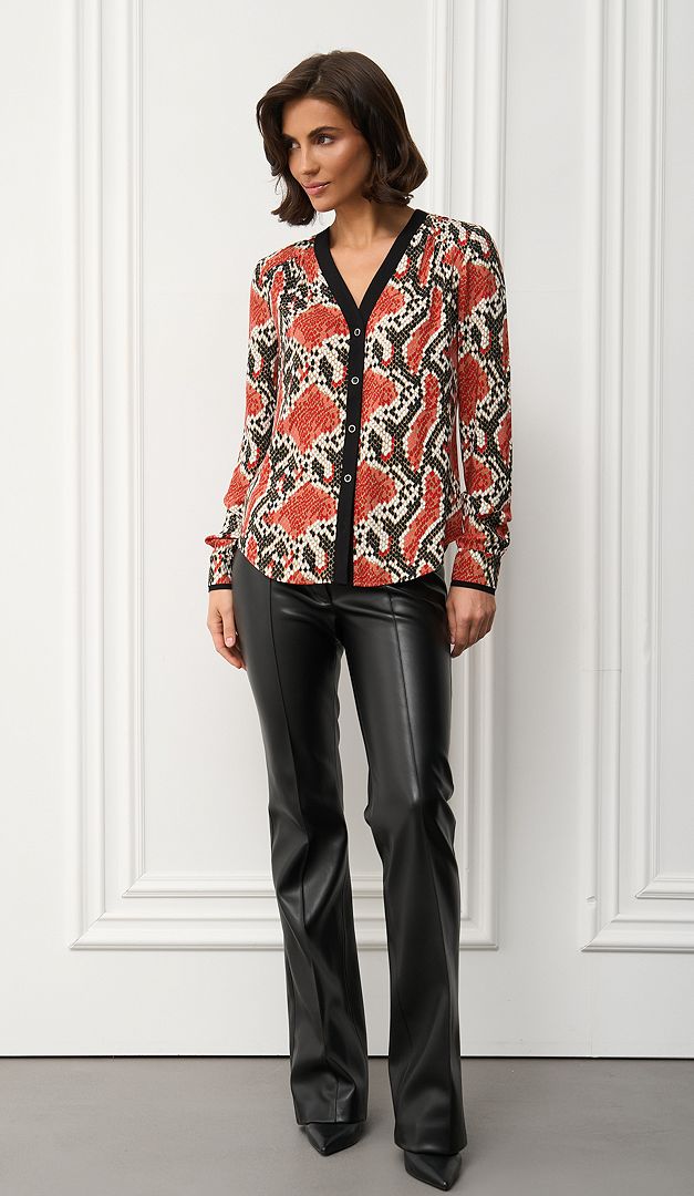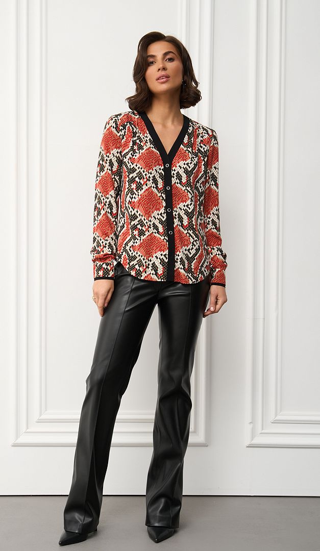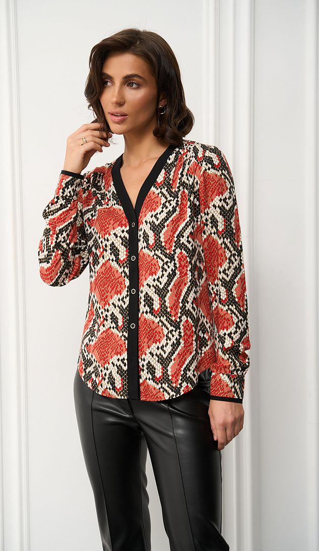 Если желаете внести разнообразие в свой повседневный гардероб — рекомендуем вам блузу в красочный змеиный принт с контрастной планкой. Блуза идеально сядет на любой фигуре, так как имеет прямой полусвободный крой. Именно эта модель благодаря V-образному вырезу горловины визуально «вытянет» силуэт. Длинный рукав по низу оформлен манжетом с тонким кантом.