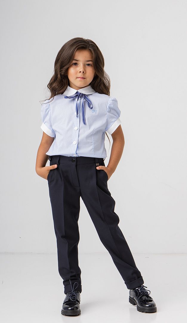 На фото создан образ с блузкой с воротником-бантом (арт.970) и блузкой голубой в клеточку (арт.938).