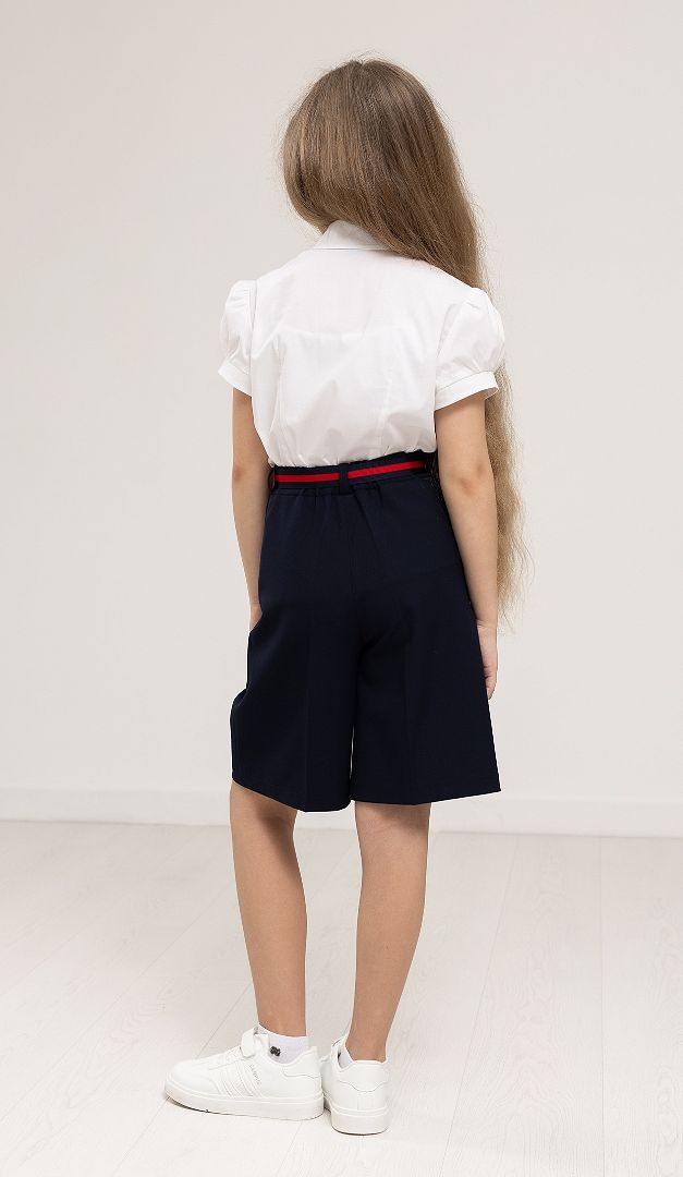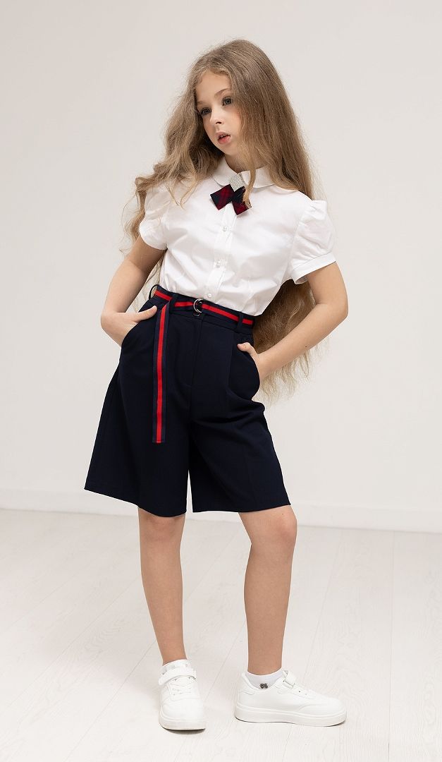 Удобные и практичные шорты-бермуды с поясом станут идеальным решением для стильных школьных образов. Эта модель, безусловно, придаст трендовости повседневному дресс-коду девочки. Модель имеет прямой свободный силуэт и среднюю посадку по фигуре. Передняя часть изделия оформлена сверху нешироким поясом и функциональными боковыми карманами. Застегивается изделие по центру на «молнию» и две пуговицы. Изнутри шорты-бермуды с поясом имеют сзади специальную резинку, которая обеспечит комфортную посадку изделия по фигуре ребенка. Линию талии подчеркивает стильный съемный пояс. Без подкладки.