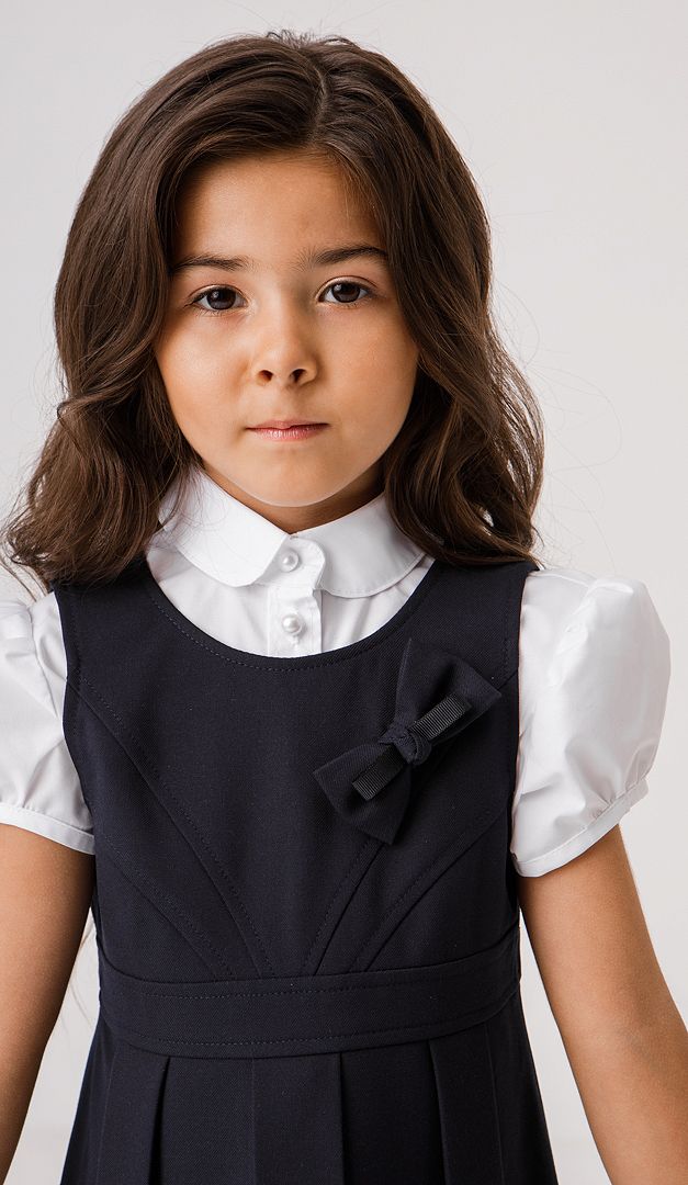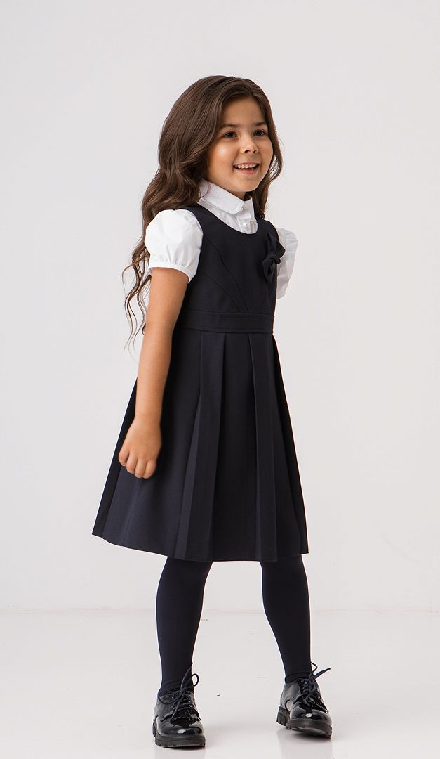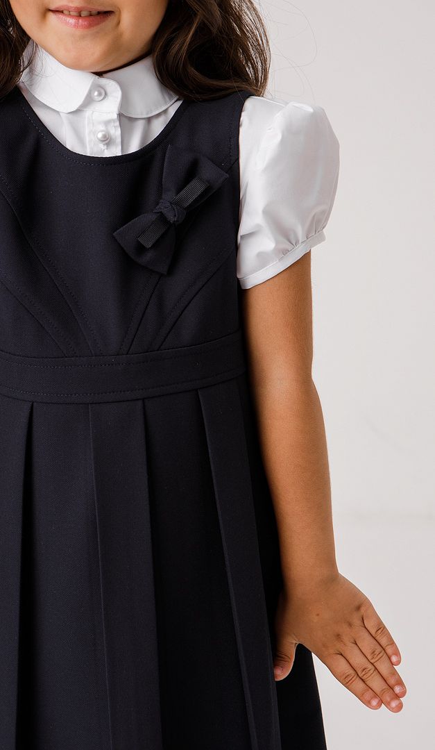 Миловидный сарафан с завышенной талией создаст образ стильной и безупречной школьницы! А-образный силуэт подойдёт для любого типа фигуры. Верх сарафана нарядно украшен диагональными декоративными подрезами и и кокетливым бантиком. Завышенная линия талии подчёркнута небольшим настроченным поясом, от которого гармонично исходят аккуратные встречные складки. Задняя часть сарафана также оригинально оформлена: она имеет неглубокий V-образный вырез, переходящий в функциональную застёжку на две пуговицы. Линия талии по спинке фиксируется изнутри с помощью резинки. Сарафан без подкладки.
