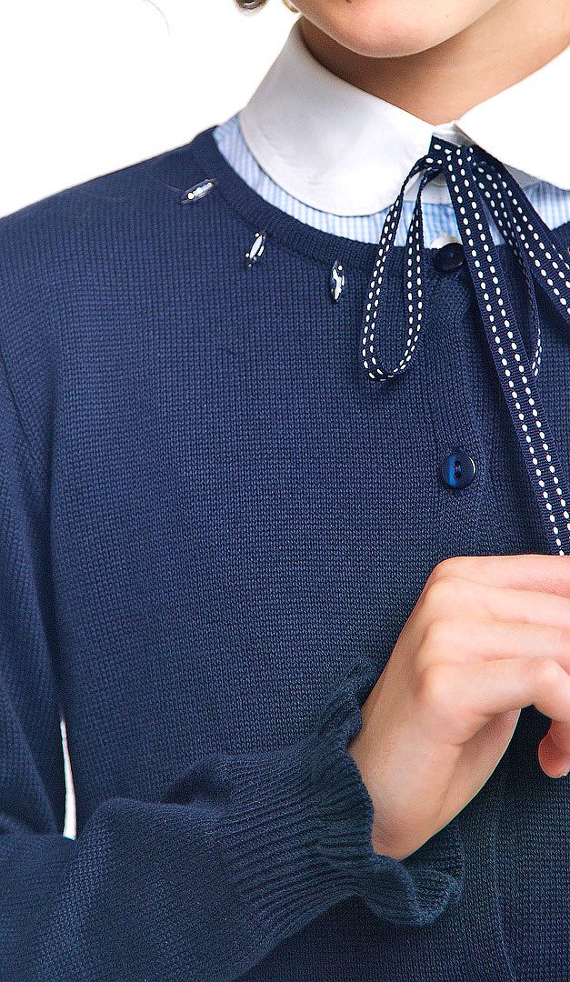 Милая трикотажная кофта для девочки — практичная и стильная альтернатива для жакета на каждый день. Изготовлена из мягкого эластичного трикотажа мелкой вязки. Модель имеет прямой крой. Застёгивается по центру на пуговицы. Неглубокий округлый вырез горловины изящно украшен декоративными камнями. Длинные рукава красиво оформлены широкими манжетами с аккуратной рюшей.