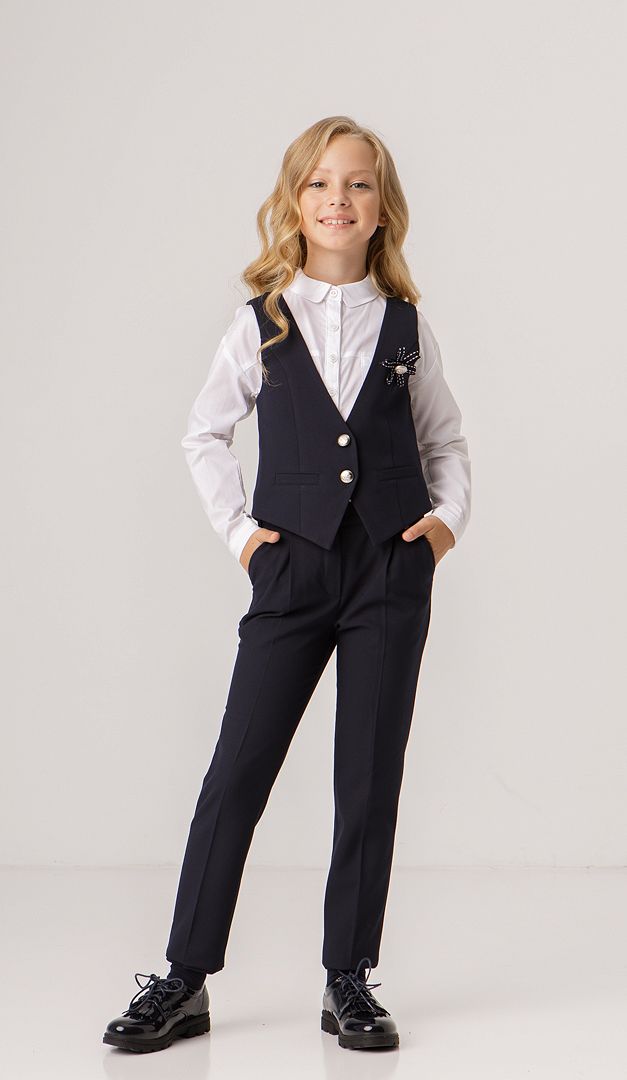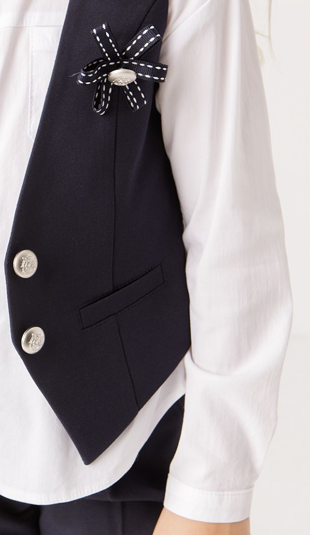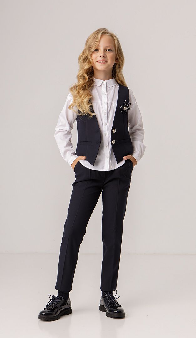 Стильная жилетка на пуговицах элегантного кроя гармонично дополнит дресс-код модной школьницы. Эта модель имеет изящный V-образный вырез горловины, красиво сочетающийся с фигурным низом. Жилетка застёгивается на две пуговицы. Чтобы модель смотрелась более нарядной, мы ее дополнили съёмной брошью, а также планками, имитирующими карманы, а спинку — декоративным хлястиком по линии талии. Изнутри жилетка оформлена атласной подкладкой.