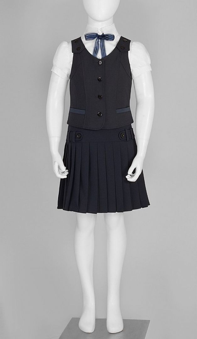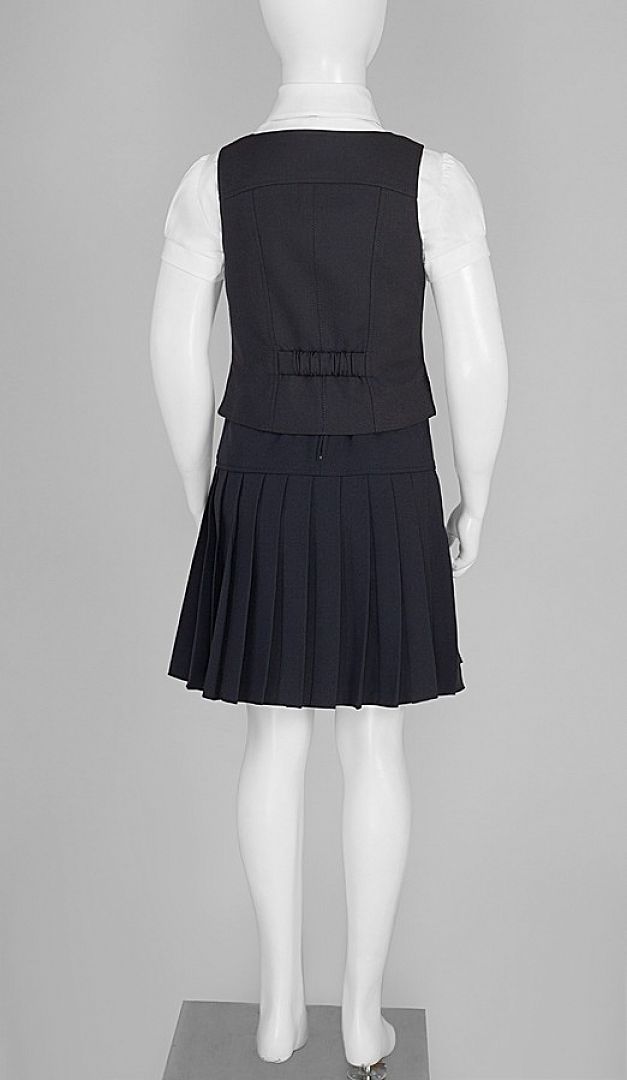Симпатичная и удобная жилетка для девочек на подкладе. Вырез горловины неглубокий и слегка V-образный. Изделие на бретелях, фиксирующихся на две пуговицы, что очень удобно для регуляции длины в зависимости от роста ребёнка. Также полочка украшена фигурными рельефами и небольшими накладными функциональными карманами. На спинке сверху находится небольшая кокетка, рельефы и хлястик на резинке по линии талии. Изделие застёгивается по центру полочки на пуговицы.