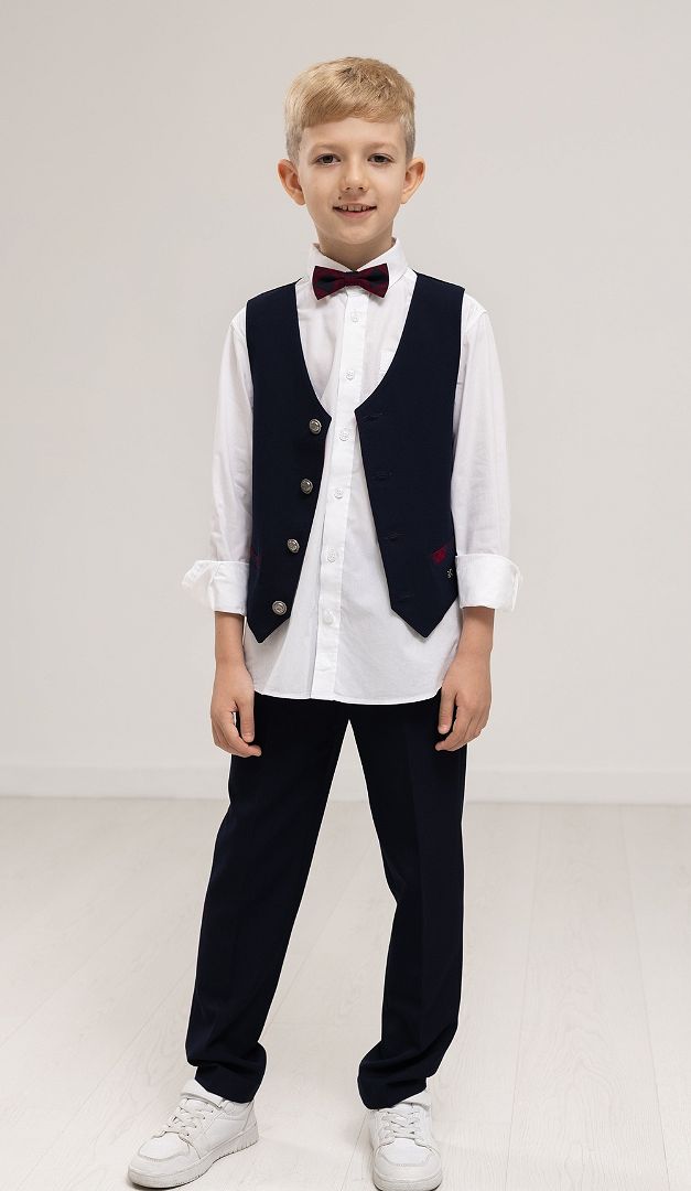 Классический и очень практичный жилет на подкладке для мальчика школьного возраста. Жилет прямого силуэта с центральной застежкой на пуговицы и декоративными карманами на полочке. Спинка с выточкой и с резинкой по линии талии.
