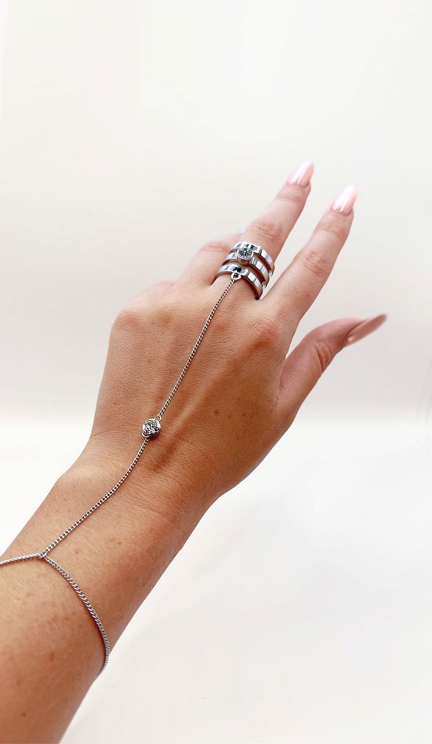 Кільце з браслетом та цирконами — оригінальний жіночний аксесуар, який неодмінно, має бути в вашому арсеналі. Це вишукане поєднання стилю та елегантності. Виріб поєднує в собі об'ємний перстень, який по центру прикрашає красивий декоративний камінь, тонкий ланцюжок-браслет на класичній застібці та додатковий ланцюжок з каменем, що з'єднує весь аксесуар в єдине ціле. Кільце з браслетом та цирконами неймовірно красиво виглядає на жіночій руці підкреслюючи її витонченість.
