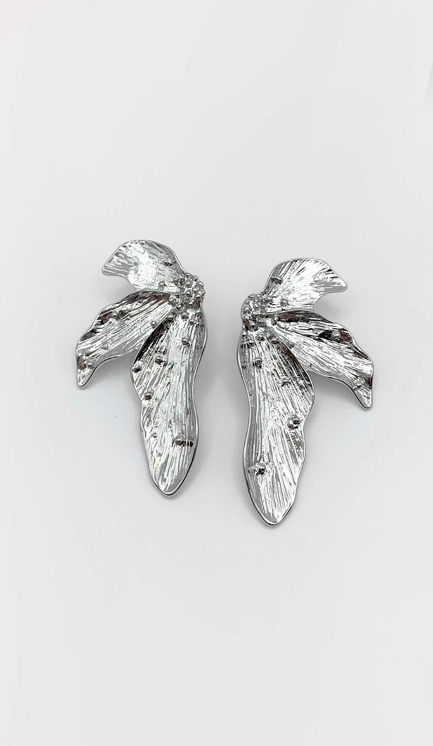 Сережки Пелюстки срібні — ефектне доповнення до образів для особливих подій. Даний аксесуар має стильну об'ємну форму, модну рельєфну фактуру і яскравий блиск. Сережки виконані у вигляді трьох квіткових пелюсток, що неодмінно додасть луку ніжності. Виріб застібаються на зручну застібку-«цвяшок».