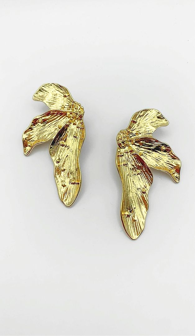 Сережки Пелюстки золоті — ефектне доповнення до образів для особливих подій. Даний аксесуар має стильну об'ємну форму, модну рельєфну фактуру і яскравий блиск. Сережки виконані у вигляді трьох квіткових пелюсток, що неодмінно додасть луку ніжності. Виріб застібаються на зручну застібку-«цвяшок».