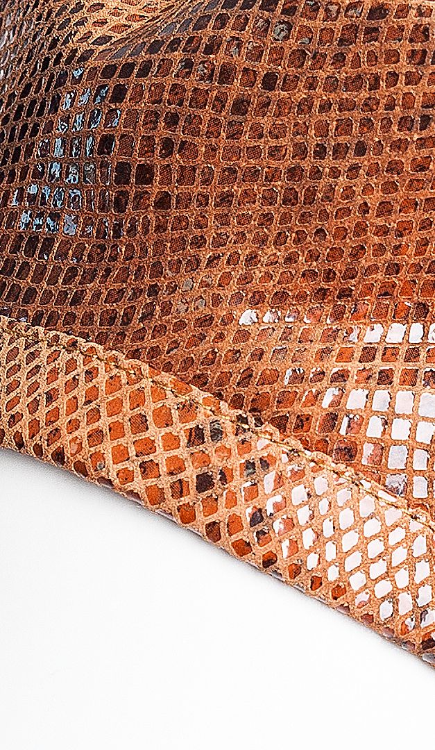 Оригінальний берет в незвичайний принт «рептилія» стане яскравим доповненням класичного пальто або куртки. Виріб по низу оформлено тонкою акуратною планкою. Модель прекрасно підійде для холодної пори року. Для максимального комфорту берет ззаду стягується на спеціальну резинку. Зсередини — на підкладці.