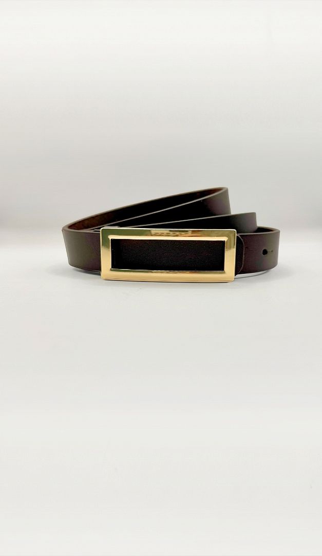 Ремінь прямокутний золото цвях коричневий — базовий жіночий аксесуар, який гармонійно доповнить будь-який образ. Виріб виконаний із натуральної шкіри у монохромному універсальному кольорі та має оригінальну контрастну пряжку-застібку з одним гапликом. Ремінь прямокутний золото цвях коричневий, безумовно, створить вдалий акцент як у аутфітах в класичному стилі, так і в луках у стилі casual.