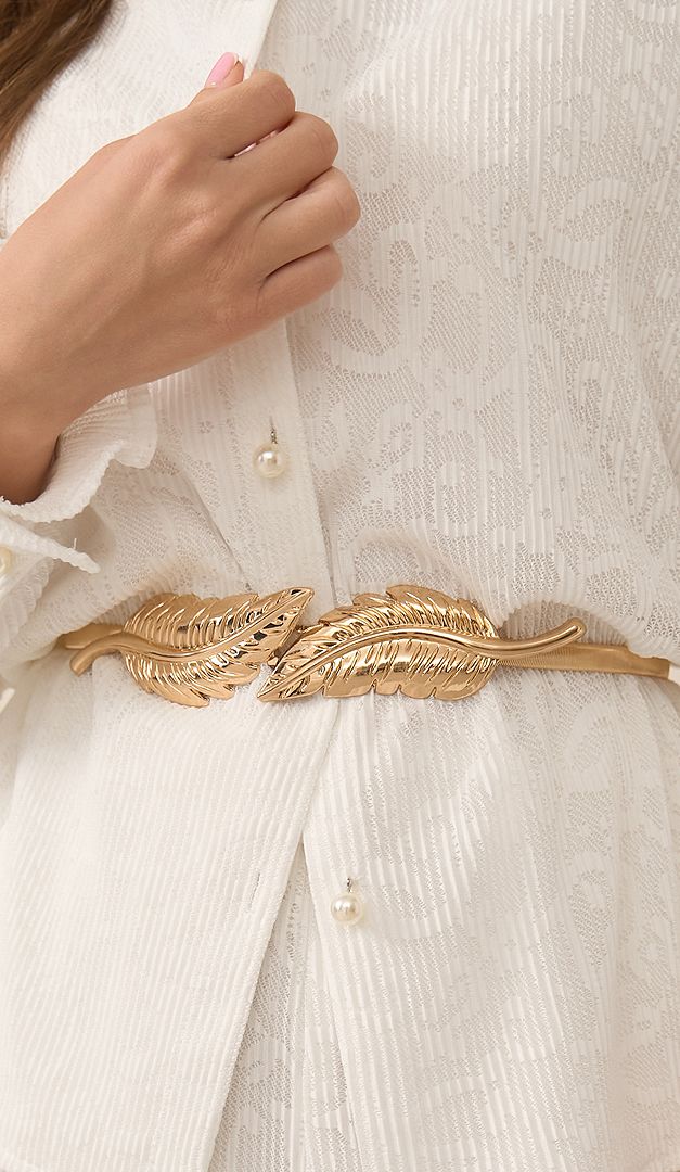 Ремінь золоті пір`їни стане витонченим акцентом у вашому образі. Виготовлений у золотистому кольорі, він привертає увагу своїм ексклюзивним дизайном. Головна прикраса — декоративна пряжка у вигляді двох рельєфних пір`їн, яка додає нотки жіночності та розкоші. Ремінь золоті пір`їни виготовлений із якісного матеріалу, який забезпечує тривале використання без втрати первісного вигляду. Довжина регулюється завдяки пружинній основі, забезпечуючи комфортну посадку на талії. Цей ремінь ідеально підходить як для додавання вишуканості до вечірнього вбрання, так і для створення стильного акценту в повсякденному луці.