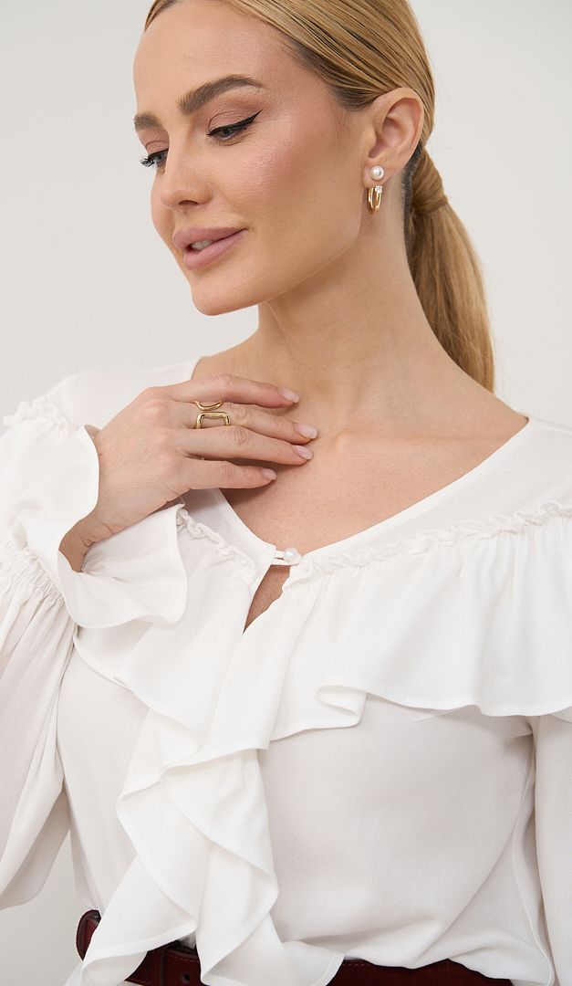 Біла блуза з рюшами додасть романтичних ноток в абсолютно будь-який образ! Ця базова модель виготовлена з дихаючої злегка зернистої віскозної тканини. Біла блуза має вільний, м'яко спадаючий фасон. V-подібний виріз горловини силуету додасть візуальної стрункості. Верх білої блузи, центр переду, а також низ рукавів оформлені пишними воланами. Блуза без застібок.