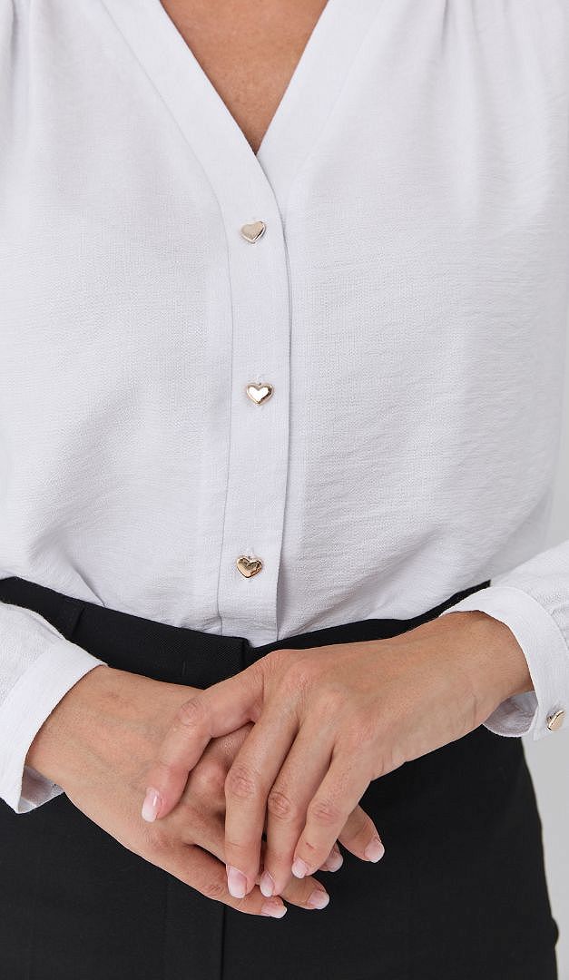Стильну базову блузу Даміра ми створили для прихильниць елегантної класики і мінімалізму. Віскозна тканина гарантує вам комфорт і практичність у використанні. Вона має прямий напівприлеглий і злегка укорочений крій зі стильно округленим низом. V-подібний виріз горловини без звичного коміра візуально витягує силует і робить образ більш витонченим. Довгий рукав оформлений тонким манжетом з застібкою на ґудзик.