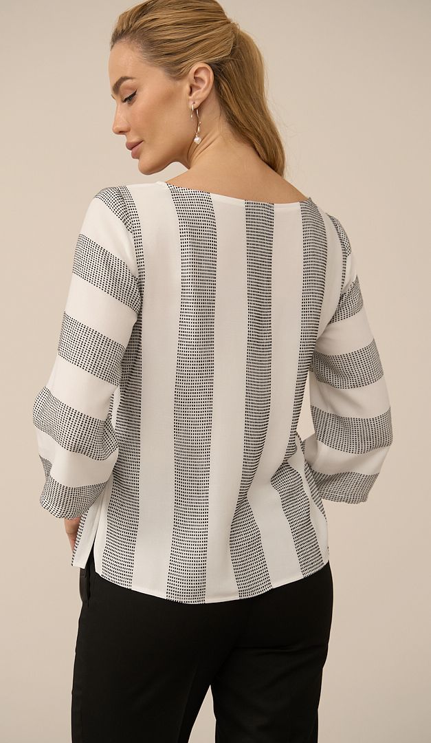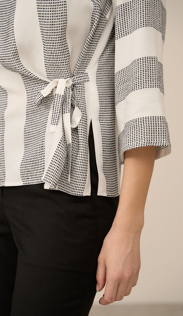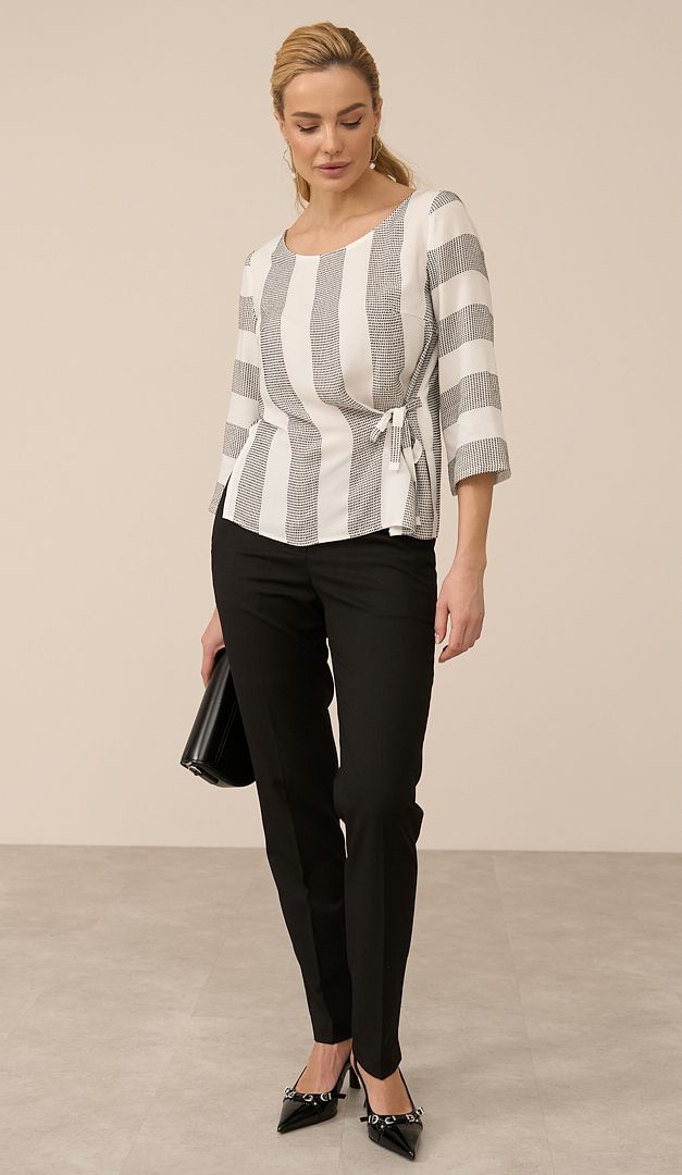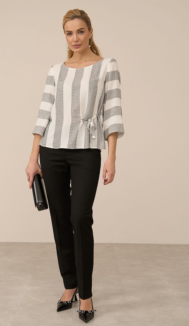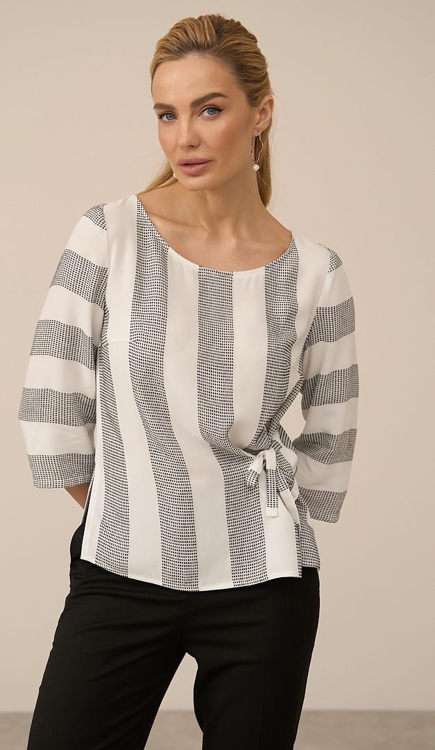 Блузка вільного крою в смужку чорну — ідеальне рішення для базового гардеробу в період спекотного літа! Вільний крій і натуральна легка тканина забезпечать цілковитий комфорт і зручність. Блузка вільного крою в смужку чорну має практичний округлий виріз горловини, вільний рукав довжиною 3/4 та високі розрізи по бокових швах. Оригінальності моделі додає функціональна зав'язка з аналогічної тканини спереду.