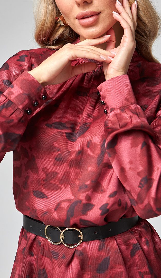 Елегантна та ефектна блузка жіноча з принтом вишнева стане яскравим доповненням до щоденних офісних образів. Модель прямого, подовженого крою, з акуратним коміром-стійкою, що ззаду застібається на два ґудзики. Блузка жіноча з принтом вишнева має довгий, вільний рукав оформлений широкою манжетою з застібкою на три ґудзики. Лінія талії підкреслена тонким поясом з аналогічної тканини, а низ моделі має невисокі розпірки по бічних швах.