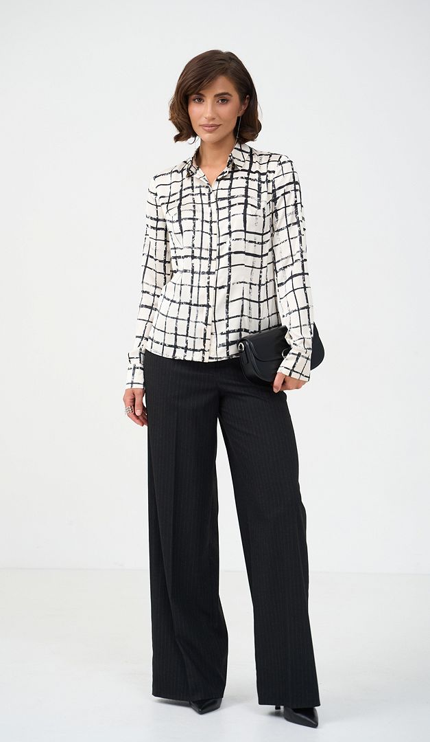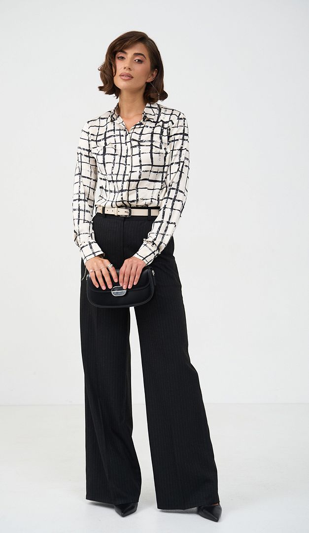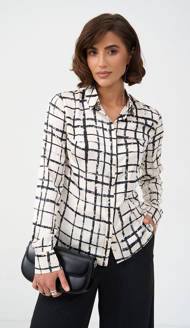 Блузка жіноча в клітинку молочна — стильна базова річ, яка неодмінно знайде своє особливе місце у вашому гардеробі. Модель напівприлеглого крою, з класичним відкладним коміром-стійкою, який переходить в зручну потайну планку-застібку на ґудзики. Також блузка жіноча в клітинку молочна має довгий рукав, що оформлений манжетою з застібкою на один ґудзик. Шовковиста тканина виробу не лише виконана з трендовим контрастним принтом “клітинка”, але й неймовірно приємна на дотик.