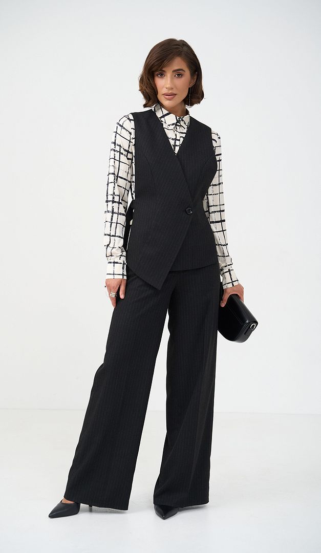 На фото створений образ з штанами прямими в смужку графіт (арт.2747) та жилетом в смужку асиметричним графіт (арт.2746).