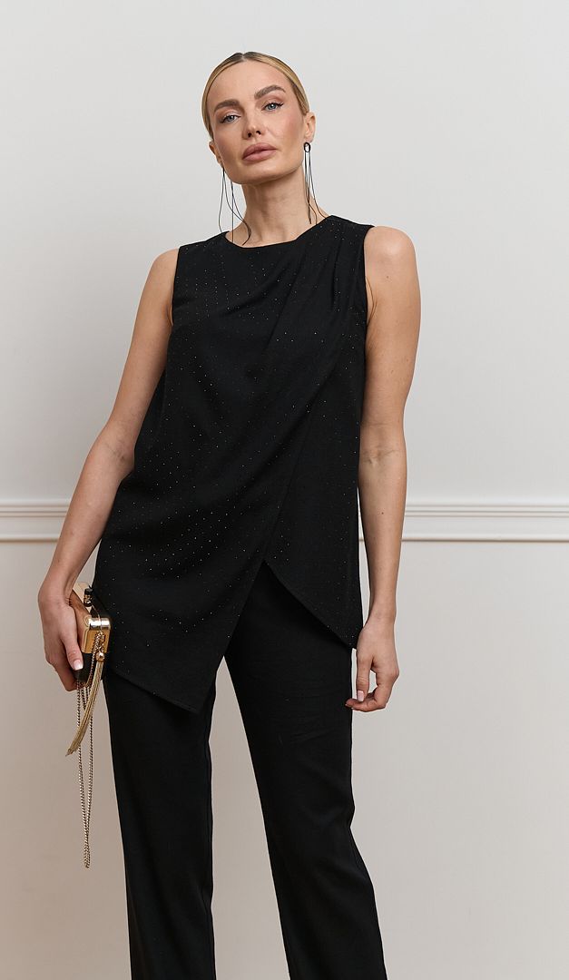 Блузон жіночий льон чорний стильне доповнення до базового літнього гардеробу. Модель розширеного до низу крою, з неглибоким округлим вирізом горловини та зручною проймою рукавів. Блузон жіночий льон чорний виконаний із легкої натуральної тканини, що забезпечить комфорт навіть у самий спекотний день. Виразності виробу додає асиметричний низ переду і трендовий ефект на запах. А мерехтливе декоративне каміння на тканині підкреслює елегантність і жіночність.