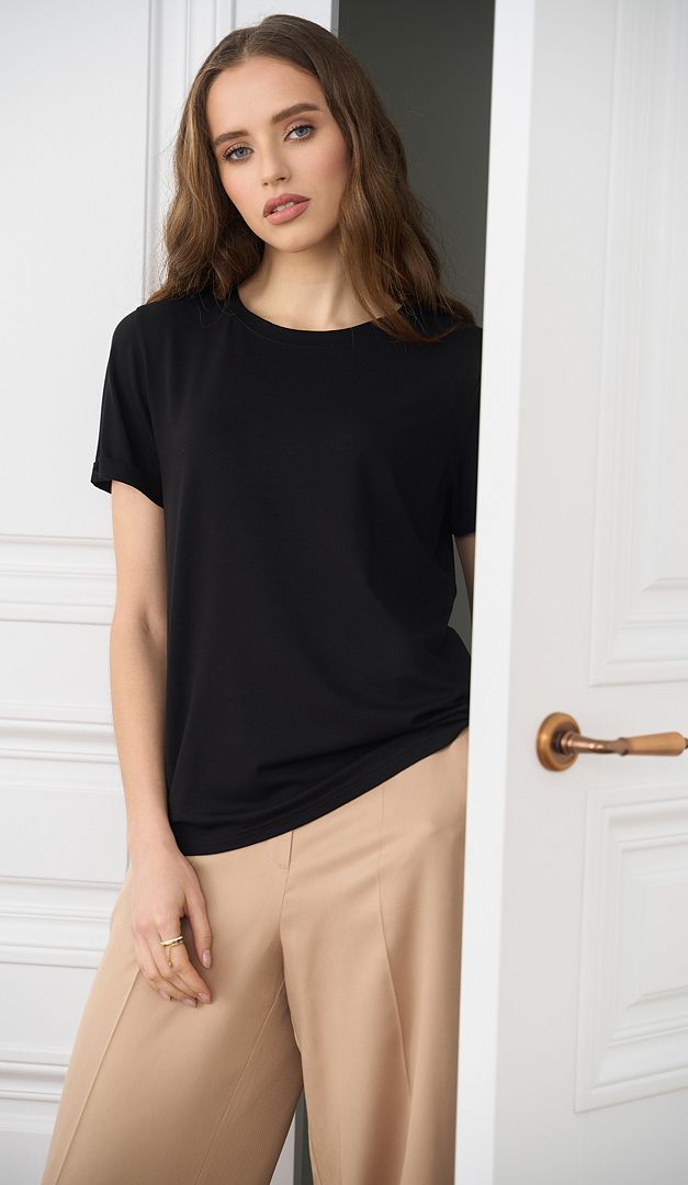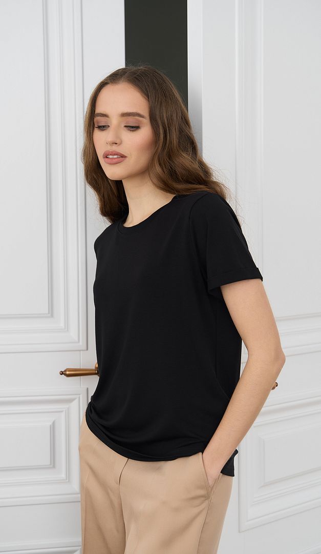 Футболка базова чорна стане вдалим доповненням до будь-якого образу. Модель вільного прямого крою, з неглибоким округлим вирізом горловини оформленим еластичною планкою і коротким рукавом з невеликим відворотом. Футболка базова чорна виконана із натуральної тканини в складі якої 95% віскози, що забезпечить тілу відчуття комфорту. Мінімалістичний дизайн і лаконічність виробу дозволяють комбінувати його як з класичними костюмами, так і в аутфітах у стилі casual.