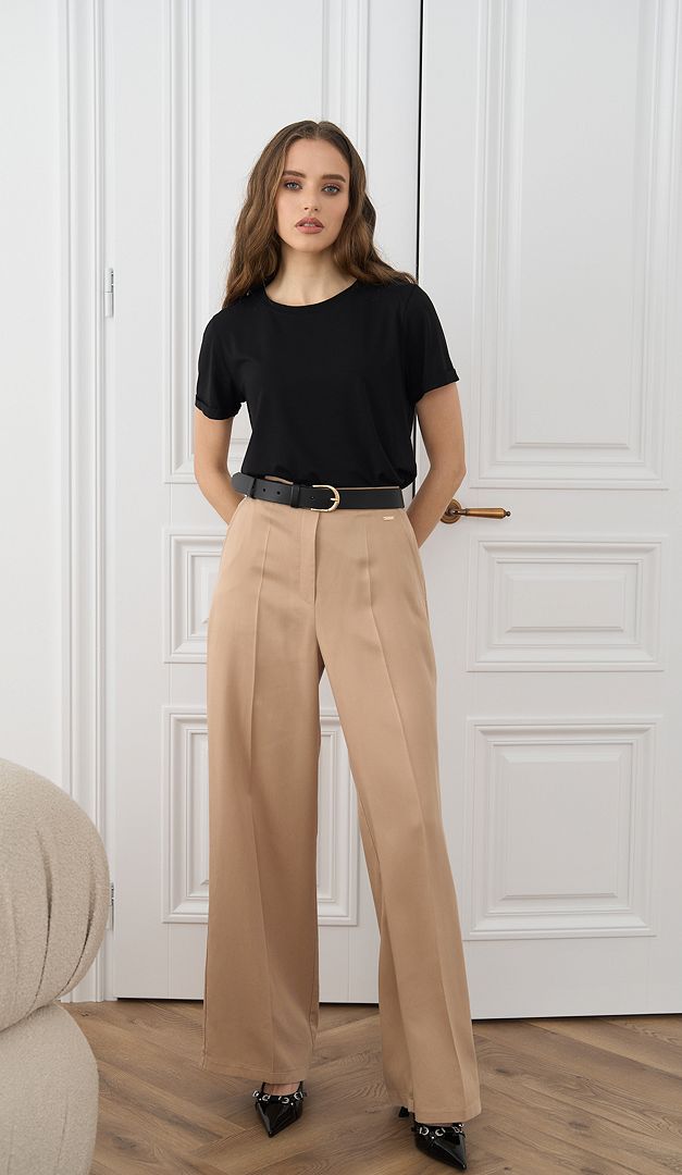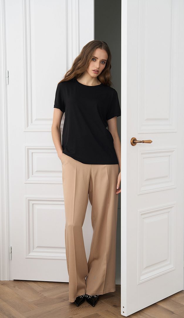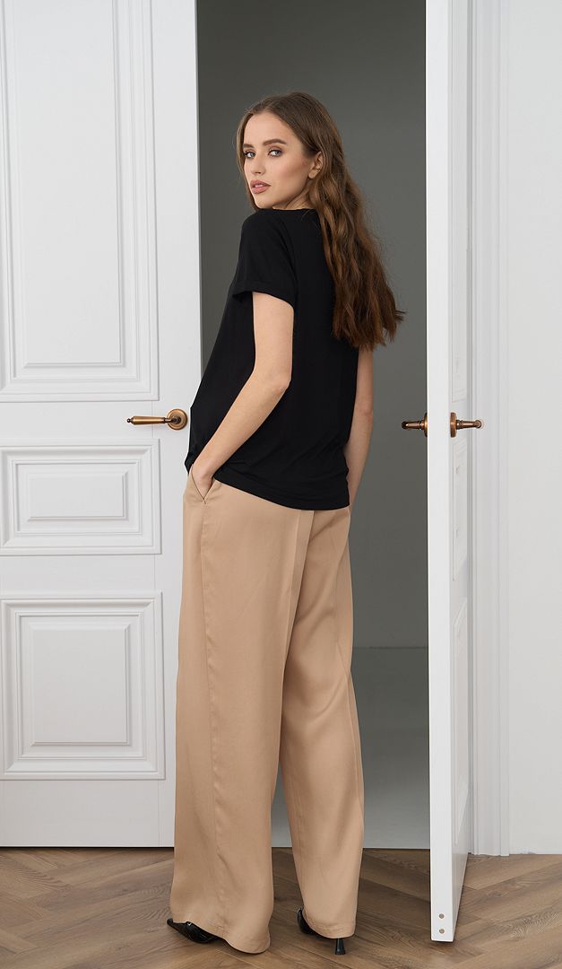 На фото створені луки з штанами прямими карамельними (арт.2657) та спідницею максі чорною з принтом (арт.2656).