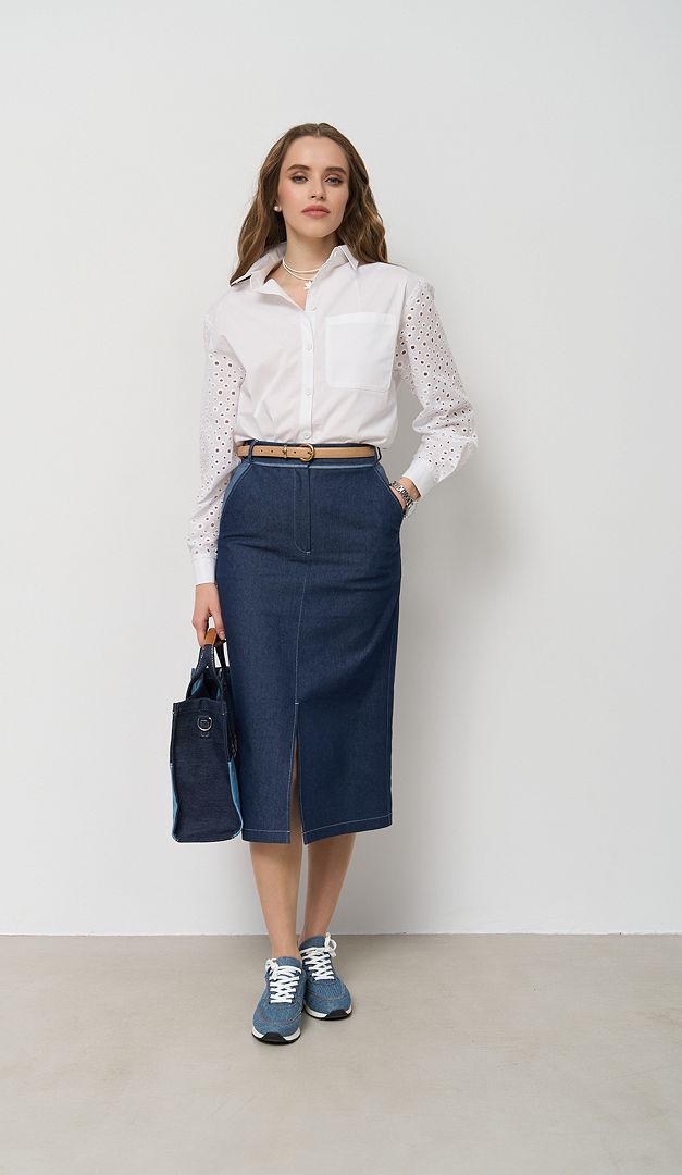 На фото створений образ із спідницею джинсовою прямою міді (арт.2704).