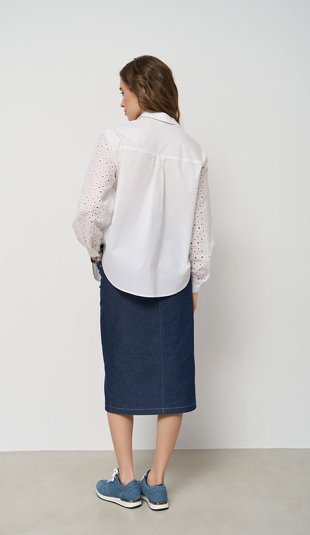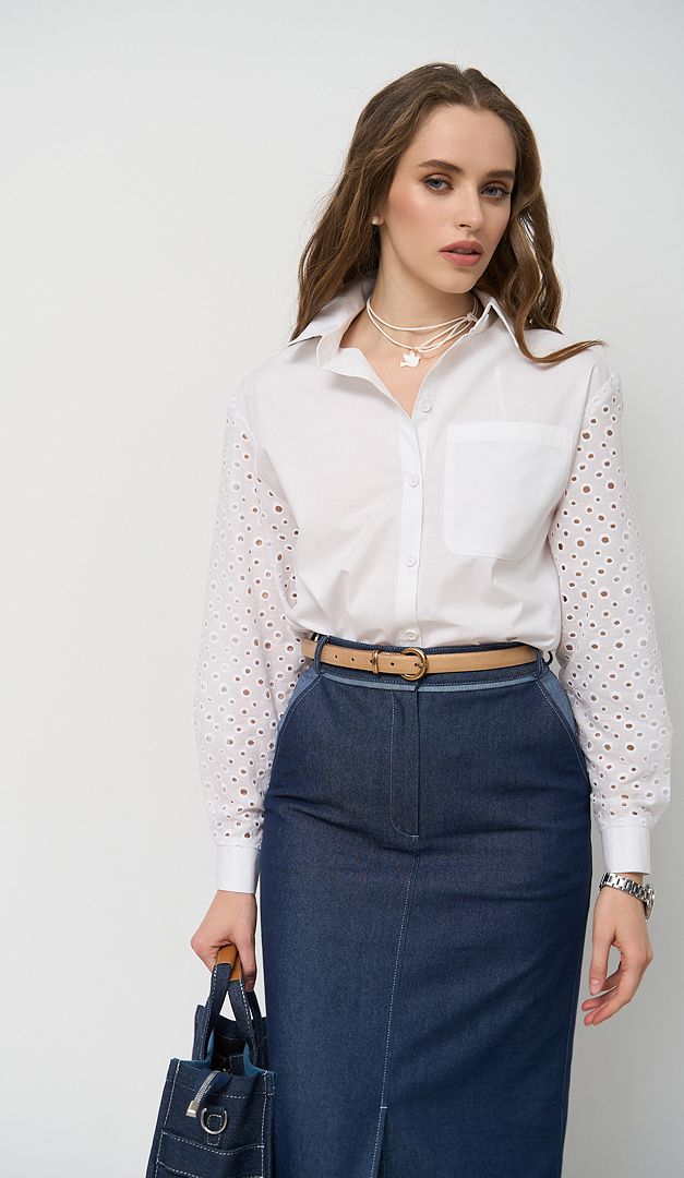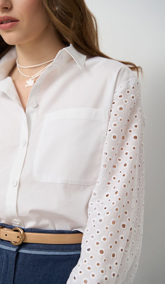 Сорочка бавовняна з ажурними рукавами — стильна базова річ, яка неодмінно, повинна бути у вашому гардеробі. Модель вільного прямого крою, з класичним відкладним коміром-стійкою, який переходить в планку-застібку на ґудзики. Сорочка бавовняна з ажурними рукавами спереду доповнена накладною кишенею та виконана із натуральної тканини — 95% бавовна. Родзинка моделі — ажурні рукави, які по низу оформлені манжетою з застібкою на один ґудзик.