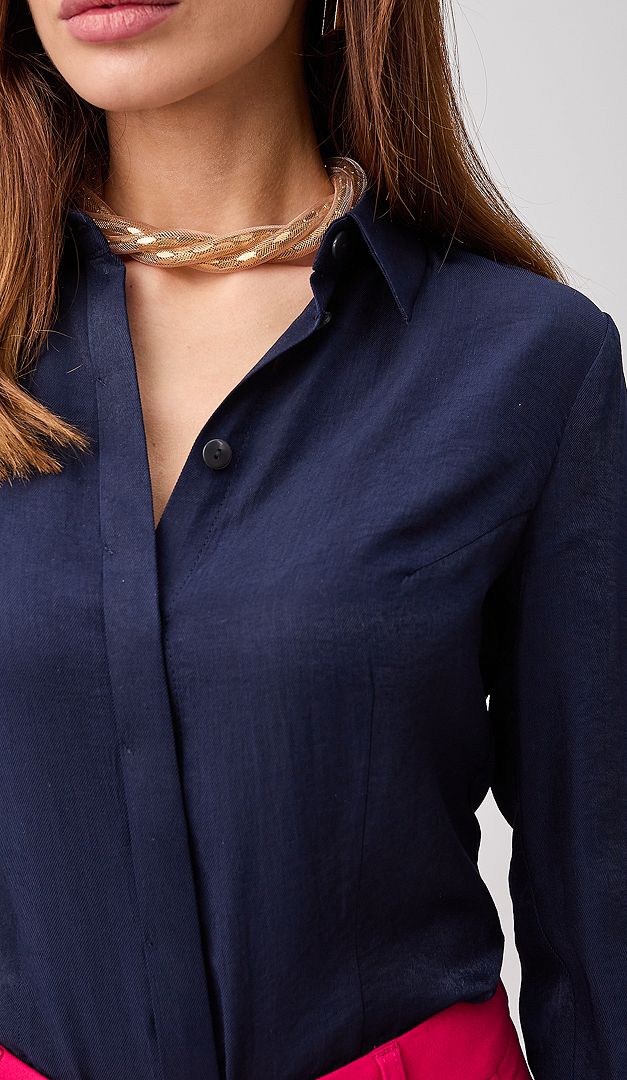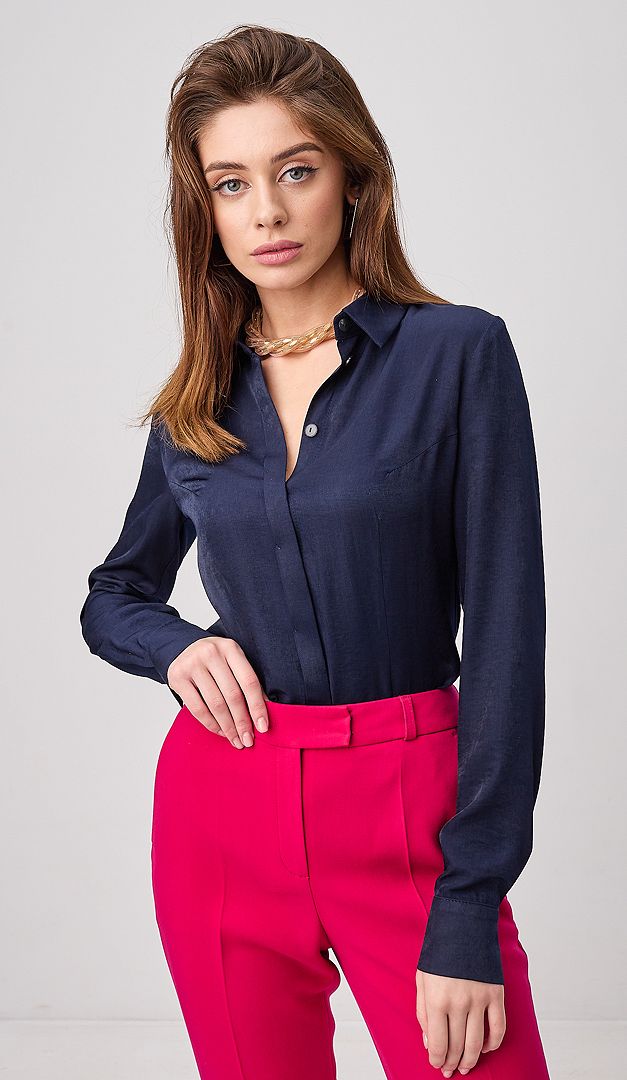 Сорочка жіноча темно-синя — це гармонійне поєднання трендового мінімалізму та комфорту. Така сорочка лаконічно доповнить будь який класичний образ та стане вдалим рішення для повсякденного аутфіту з улюбленими джинсами. Сорочка жіноча темно-синя виконана з акуратним відкладним коміром, довгим прямим рукавом оформленим манжетою із застібкою на ґудзик та потайною планкою-застібкою на ґудзики по переду виробу. А особливої елегантності та стилю сорочка жіноча темно-синя набуває за рахунок монохромної і дуже приємної на дотик шовковистої тканини, до складу якої входить 75% віскози.