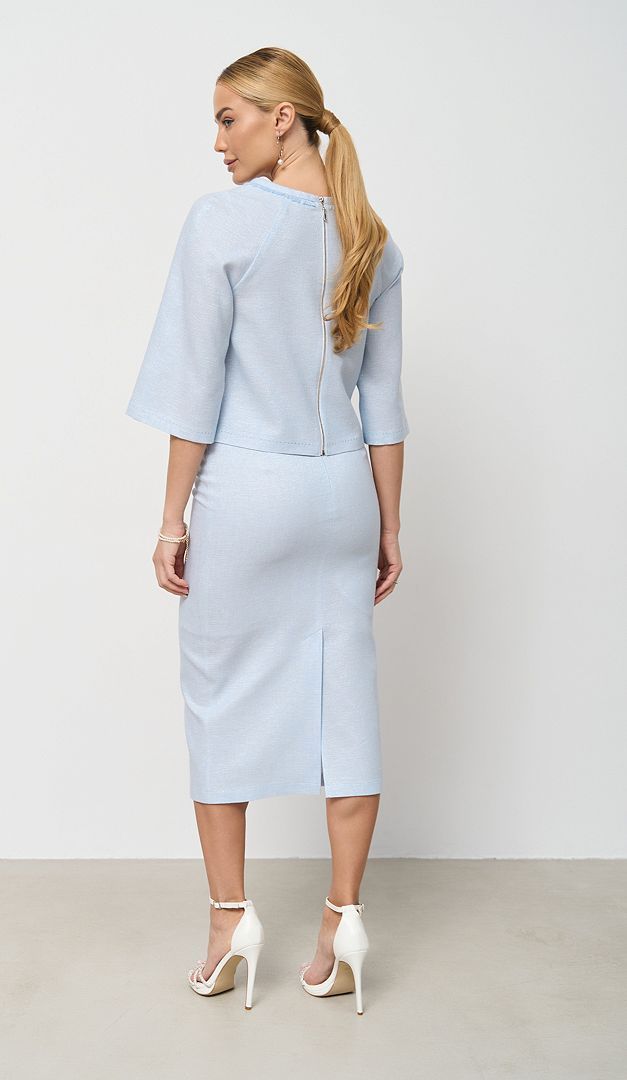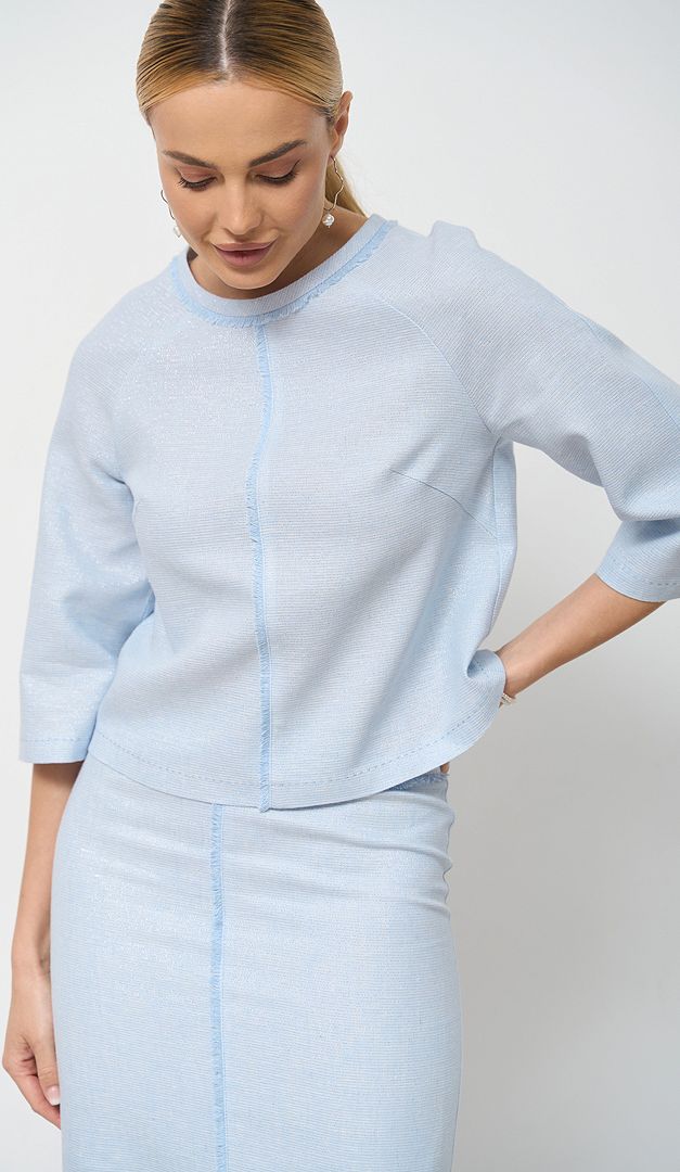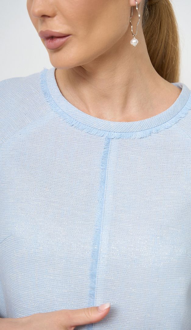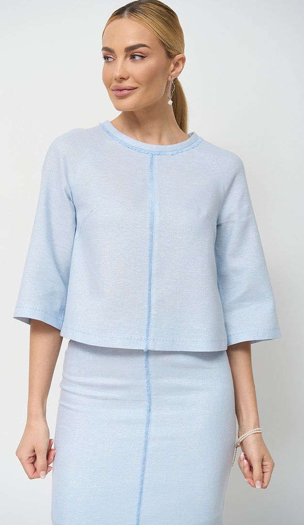 Топ з бахромою блакитний — стильне рішення як для офісних образів так і для урочистих подій. Модель прямого вільного крою, з неглибоким округлим вирізом горловини і укороченим цільно кроєним рукавом. Топ з бахромою блакитний має функціональну застібку-блискавку, розташовану по центру всієї спинки, що додає виробу оригінальності. А коротка бахрома, якою оздоблена горловина і центр переду підкреслюють елегантність створеного луку.