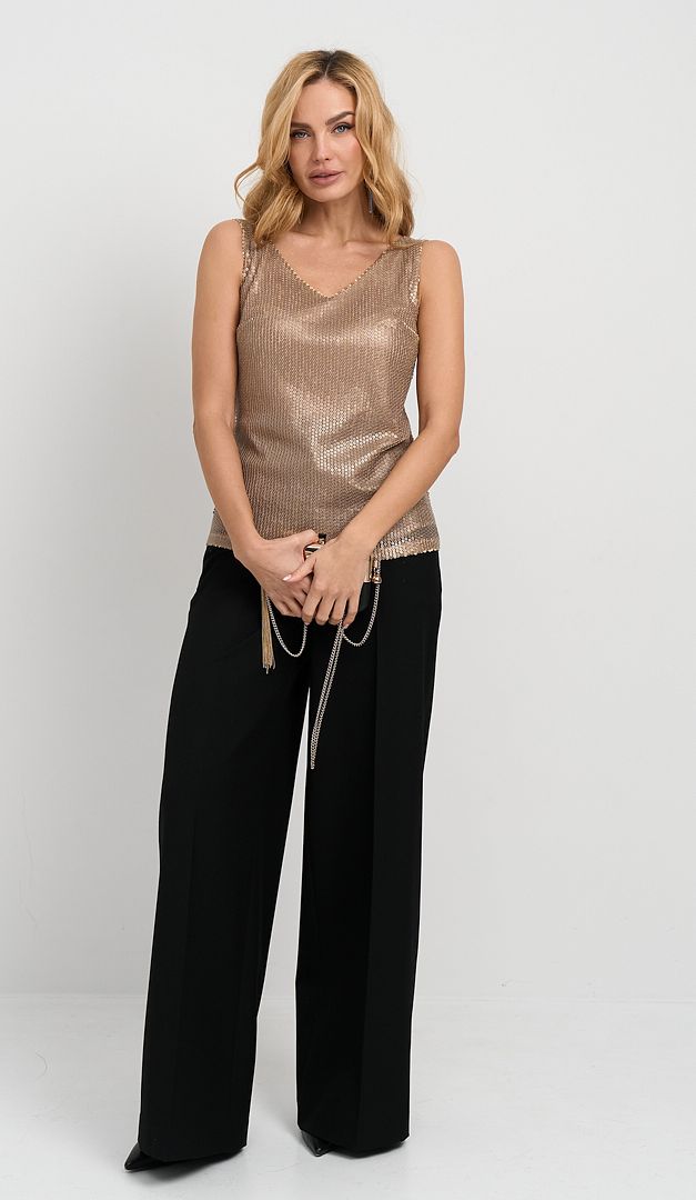 Стильний та ефектний топ з паєтками золотий стане ідеальним доповненням до святкового образу. Завдяки універсальному кольору та лаконічному дизайну, виріб буде вдало комбінуватися, як зі стриманими класичними костюмами, так і з екстравагантними спідницями чи брюками. Топ з паєтками золотий виконаний із легкої, напівпрозорої тканини та має вільний прямий крій з V-подібним вирізом горловини. По переду виробу є додаткова тонка підкладка.