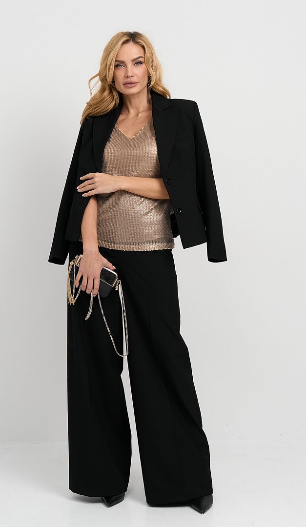 На фото створений образ з штанами палаццо чорними (арт.2219) і жакетом двобортним чорним (арт.4008).