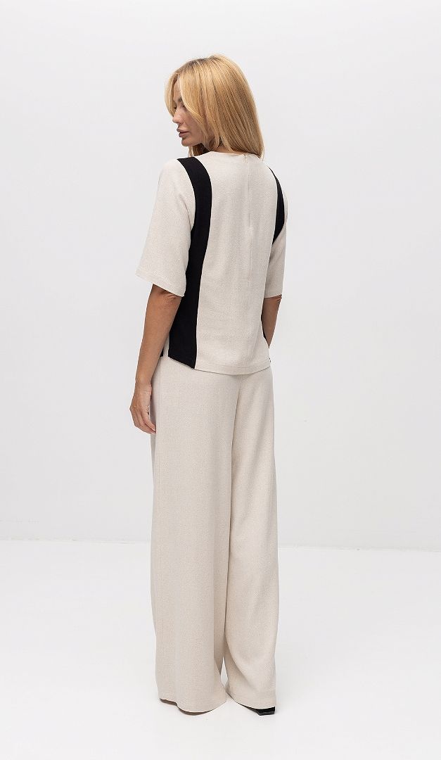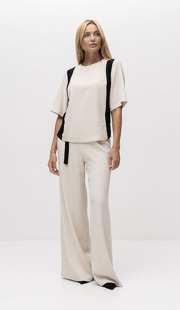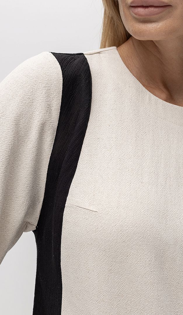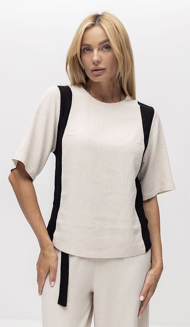 Топ жіночий льон з вставками — стильне рішення як для офісних образів так і для урочистих подій. Модель прямого вільного крою, з неглибоким округлим вирізом горловини і коротким вільним рукавом. Топ жіночий льон з вставками має функціональну застібку-блискавку, розташовану в центральному шві по спинці. Ефектності виробу додають контрастні вертикальні вставки та невисокі розрізи з боків.