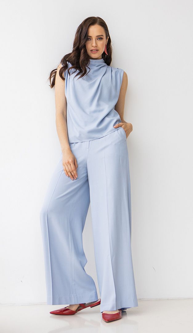 Екстравагантний топ з драпіруванням в спокійному блакитному відтінку рекомендуємо для ділових зустрічей і офісних буднів. Також ця базова, за рахунок лаконічного дизайну, модель підійде і для урочистих подій. Топ має вільний прямий крій. Родзинка — це елегантний цільнокроєний комір-стійка з красиво лягаючими складками. Для зручності одягання по верху спинки розташована застібка- «блискавка». Виготовлений топ з зернистої на дотик 100% -вої віскози.