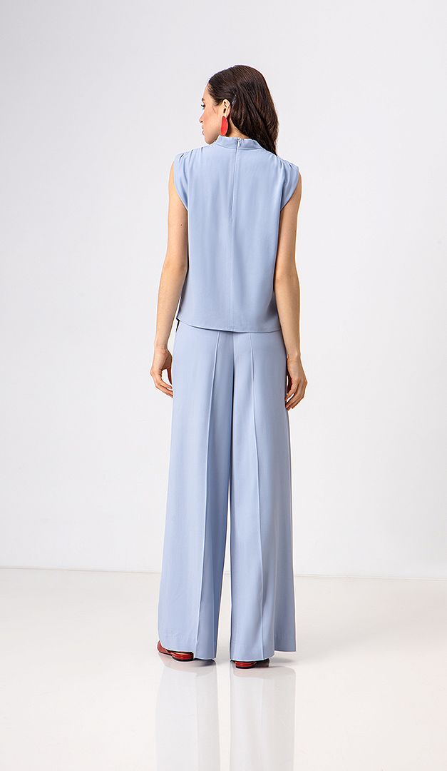 Брюки палаццо блакитні — модель прямого вільного крою, яка допоможе Вам створити елегантний образ і сформувати красивий «витягнутий» силует. Матеріал брюк палаццо — ідеальний на літо — легкий, 100% віскоза. Посадка брюк середня — з настроченим поясом і функціональними кишенями. Застібаються брюки на «блискавку», гачок і ґудзик.