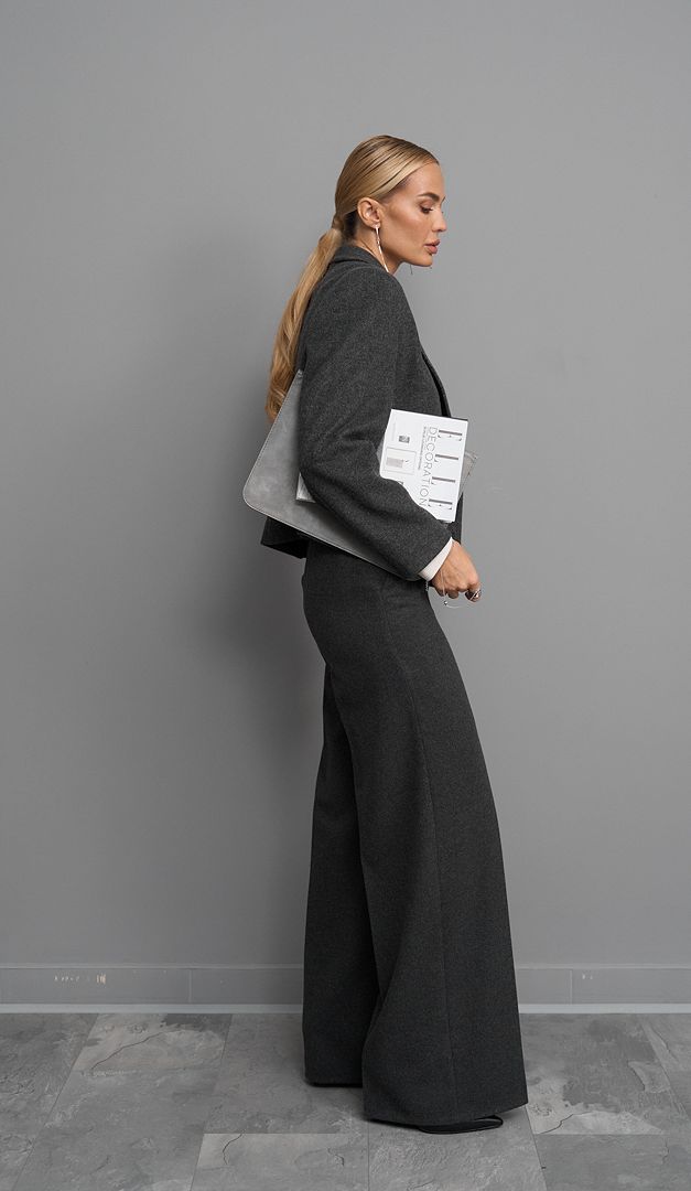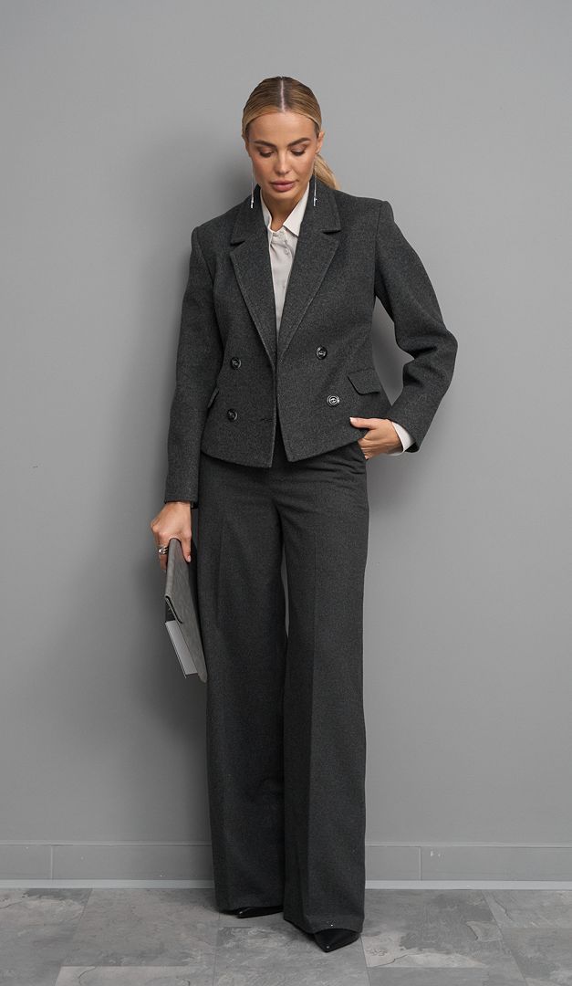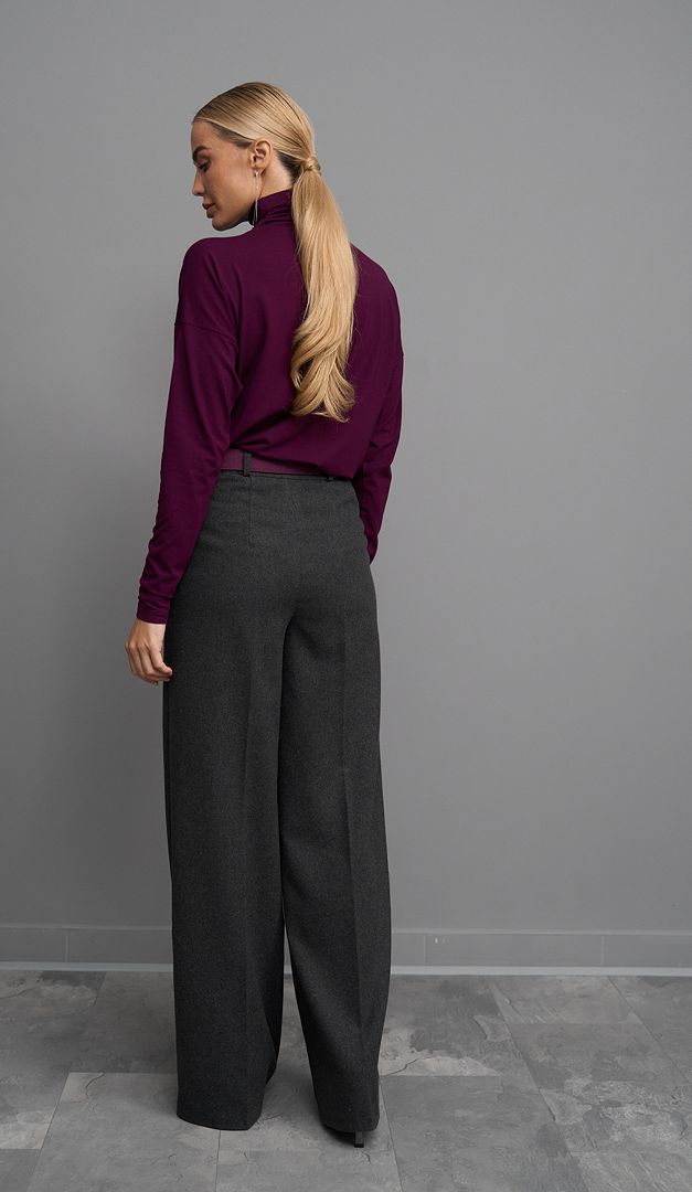 На фото створений образ з гольфом оверсайз бордовим (арт.4000), жакетом двобортним теплим сірим (арт.2798) і сорочкою базовою сірою (арт.2731).