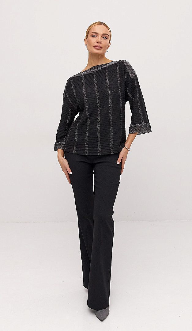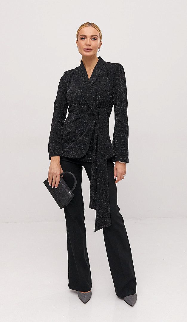 На фото створений образ з жакетом святковим чорним (арт.2459), топом святковим чорним (арт.2814) і блузоном чорним з сріблом (арт.2169).