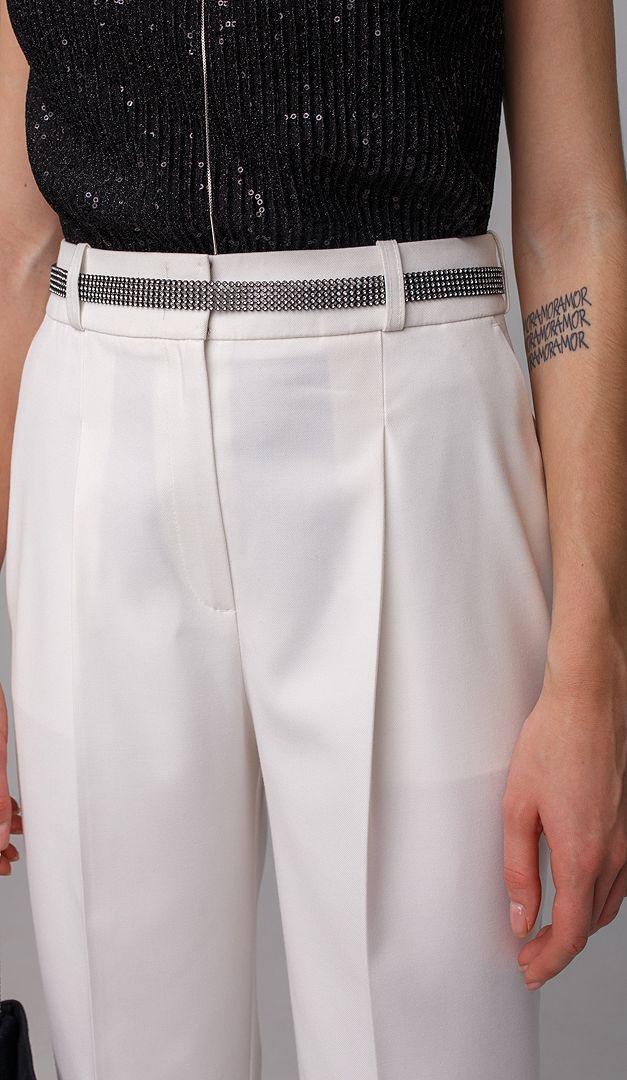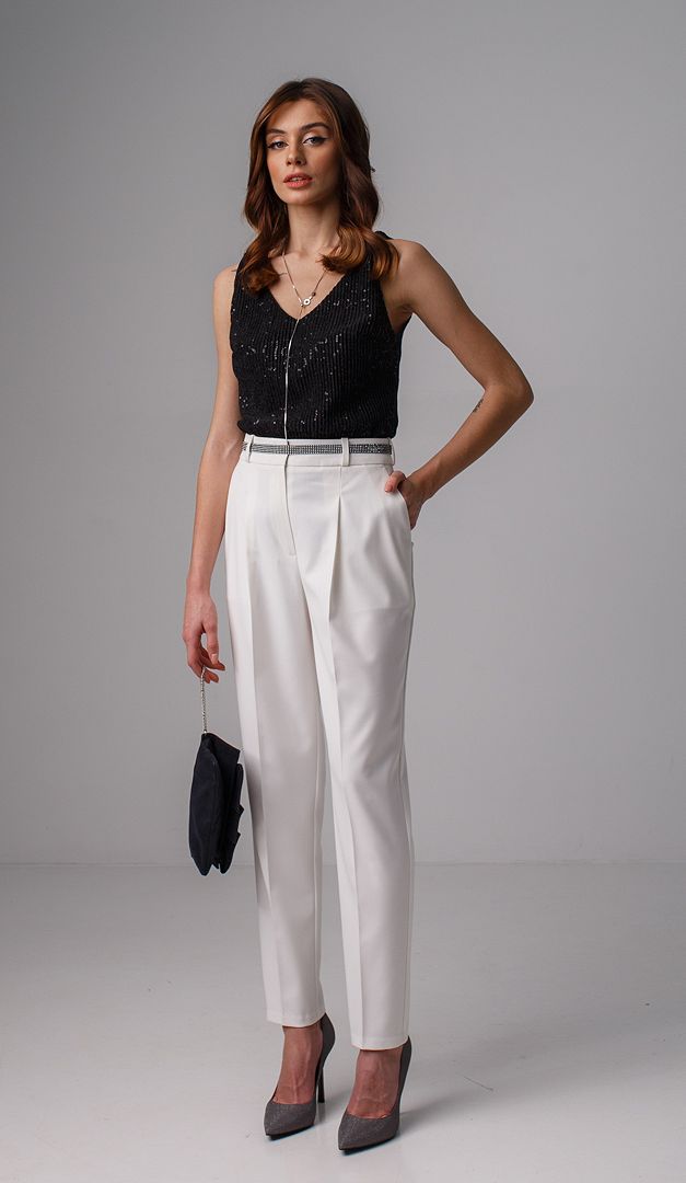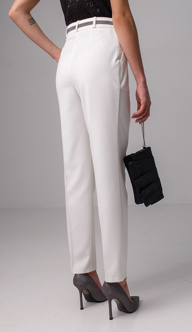 Брюки з високою посадкою молочні базова річ, яка неодмінно, повинна бути в гардеробі кожної модниці. Модель з високою посадкою по фігурі. Верх молочних брюк виконаний з пришивним поясом, бічними функціональними кишенями та зручною застібкою на “блискавку”, два гаплика і додатковий потайний ґудзик. Брюки з високою посадкою молочні мають напівприлеглий, злегка звужений до низу крій. Запрасовані “стрілки” візуально додадуть жіночому силуету стрункості. Ця модель стане вдалим рішенням, як для офісного дрес-коду, так і для святкових образів.