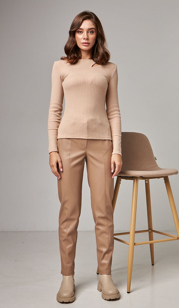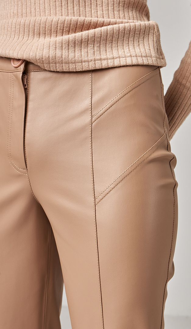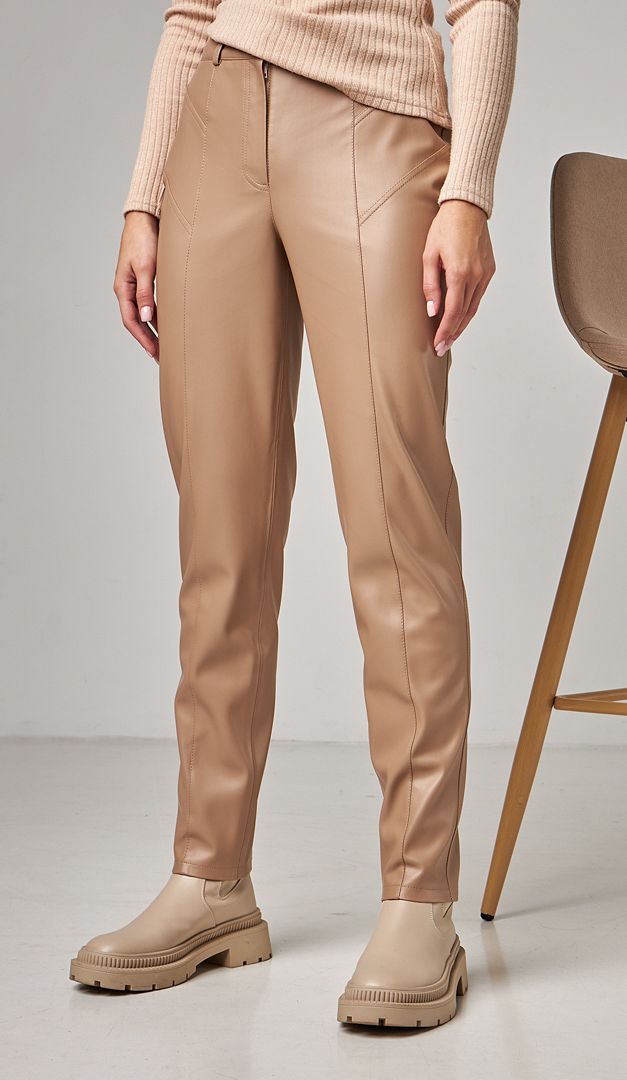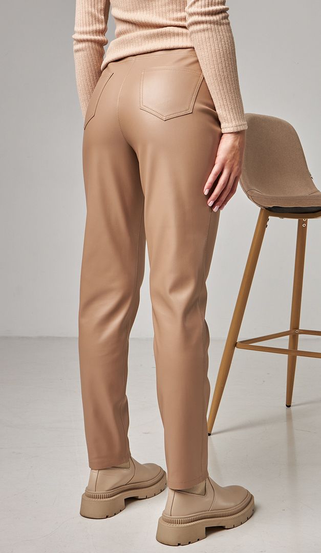 Брюки жіночі з екошкіри бежеві, безумовний must have базового гардеробу в цьому сезоні! Модель має звужений напівприлеглий крій і комфортну середню посадку по талії. Брюки жіночі з екошкіри бежеві застібаються на “блискавку” й один ґудзик, пояс оформлений петлями, що дозволяє стильно підкреслити талію ремінцем. Ззаду виробу розташовані функціональні накладні кишені, а перед — декорований швами- «стрілками», які візуально додають стрункості жіночому силуету.