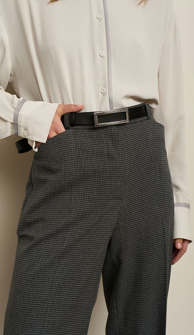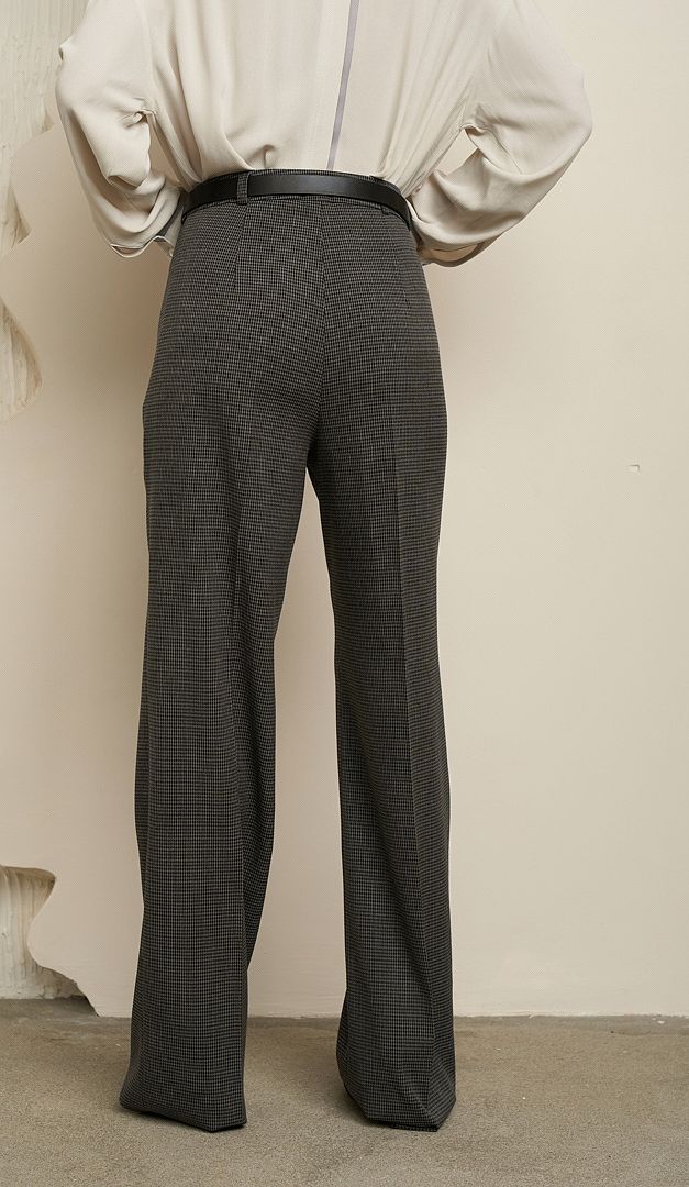 Штани жіночі кльош чорний меланж стануть вдалим рішенням, для створення стильних офісних образів. Модель має високу посадку по фігурі, прямий вільний крій і дві практичні кишені. Штани жіночі кльош чорний меланж застібаються на блискавку, один гаплик і ґудзик. Верх моделі оформлений класичним поясом з петлями. Запрасовані стрілки підкреслюють стрункість силуету, а оригінальний чорно-сірий принт буде вдало комбінується з будь-яким верхом. Без підкладки.