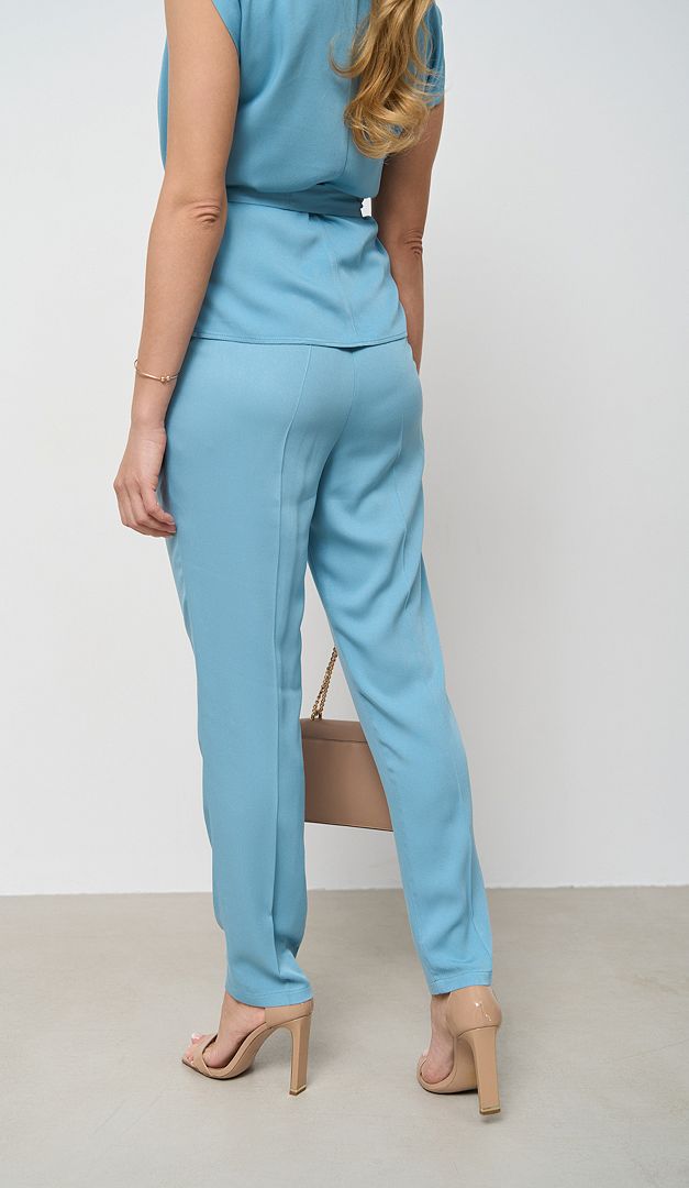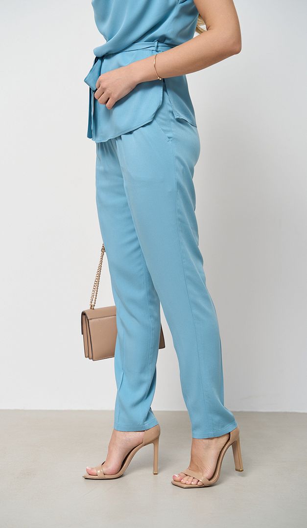 Для спекотних літніх днів в які так хочеться створити стильний і водночас зручний образ, ідеальним рішенням стануть брюки жіночі з резинкою на поясі бірюза. Ця базова модель вдало впишеться як у ділові, так і повсякденні аутфіти. Брюки жіночі з резинкою на поясі бірюза мають середню посадку по фігурі, напівприлеглий крій, функціональні кишені з боків та широкий практичний пояс-резинку. Без додаткових застібок. Оригінальні складки біля поясу та запрасовані стрілки на брючинах візуально підкреслять довжину та стрункість ніг. Тканина із 100% віскози добре пропускає повітря, щільна, але при цьому легка і трохи тягнеться.