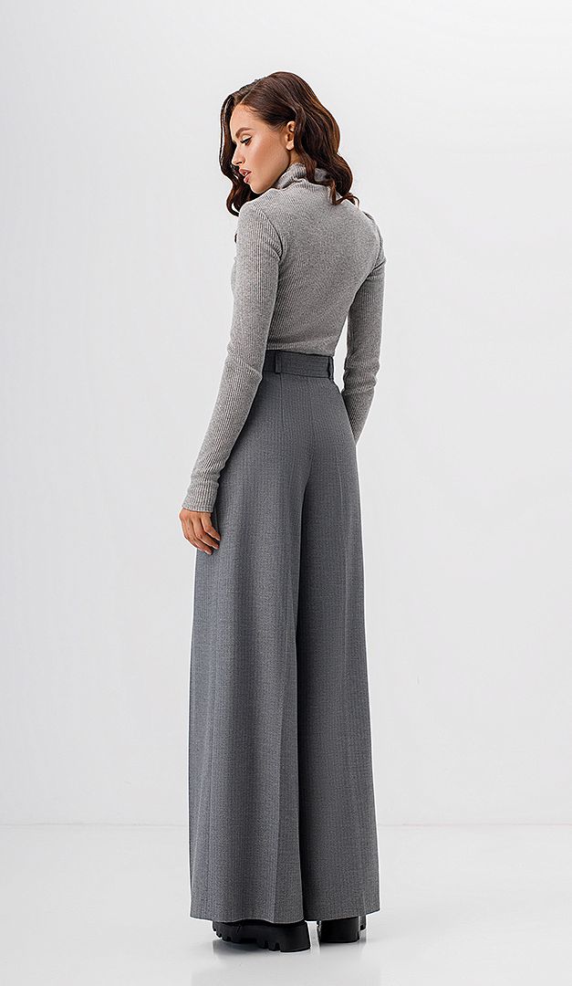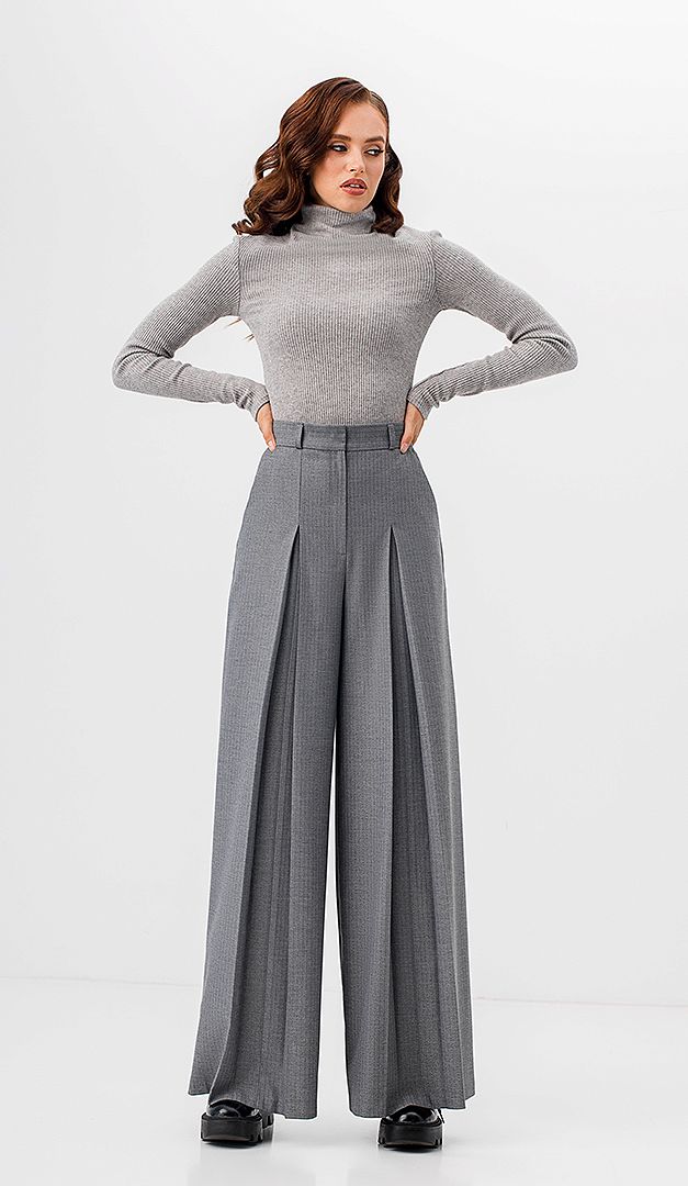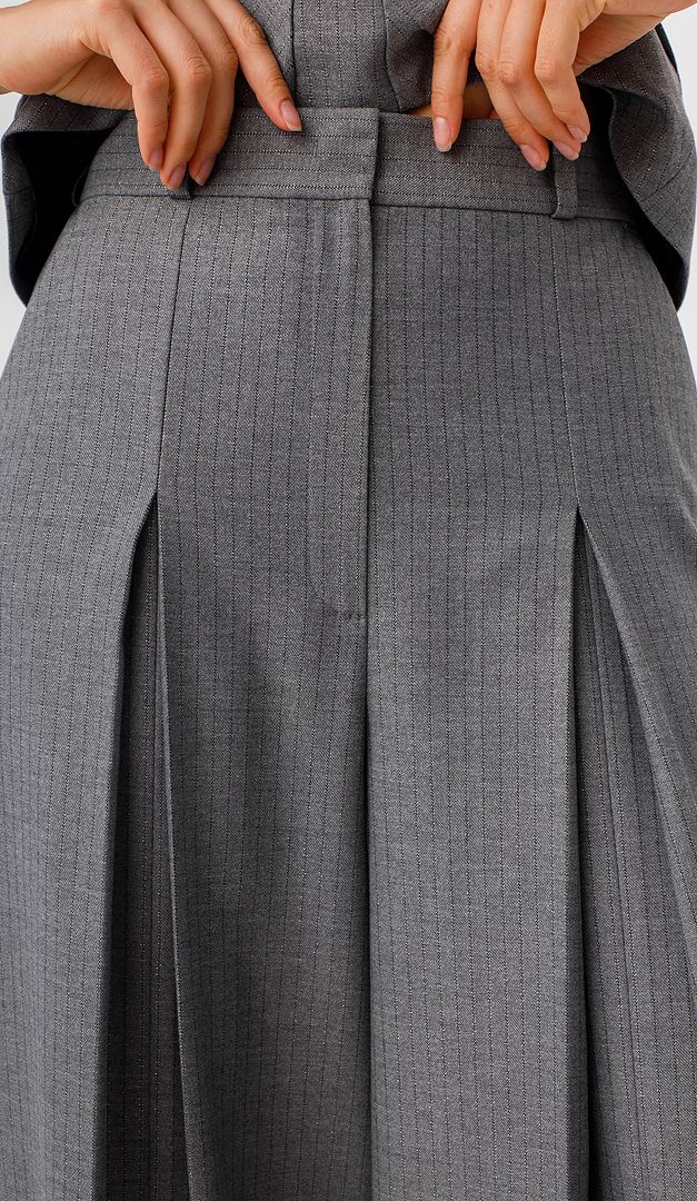 Широкі брюки в смужку в трендовому фасоні палаццо — це саме той елемент гардеробу, який зробить Ваш образ більш ефектним та виразним! Середня посадка по фігурі. Верх широких брюк оформлений настроченим нешироким поясом з петлями і функціональними кишенями. Застібаються брюки на потаємну «блискавку», ґудзик і гачок. Класичний крій брючин оригінально по центру доповнений запрасованими акуратними складками. Широкі брюки без підкладки.