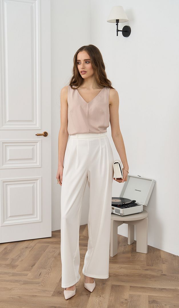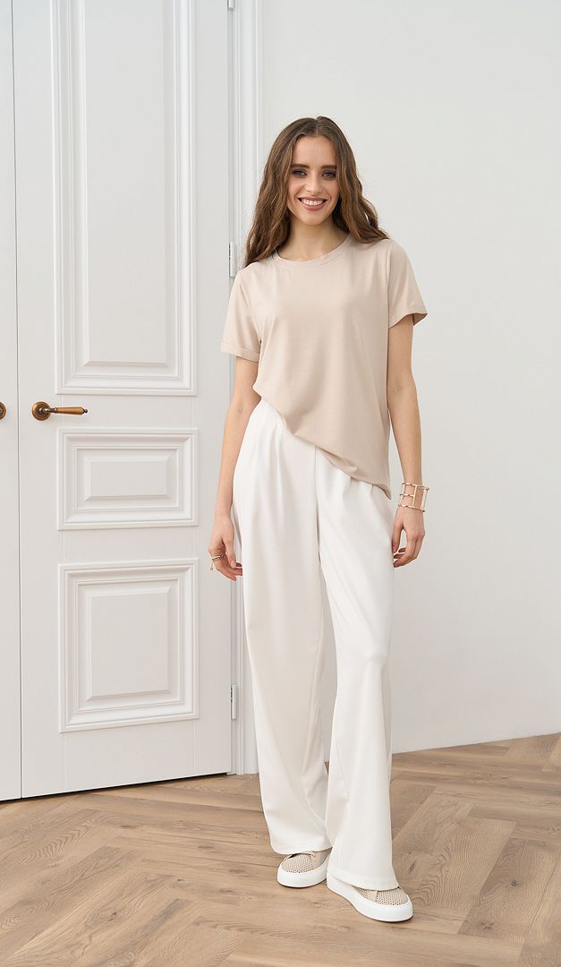Штани жіночі прямі молочні — трендова річ для весняно-літнього гардеробу. Модель прямого вільного крою. Верх оформлений еластичною резинкою ззаду та оригінальною планкою з застібкою на один ґудзик спереду. Штани жіночі прямі молочні мають середню посадку по фігурі. Завдяки своїй лаконічності та універсальності до моделі пасуватиме практично будь-який верх із вашого арсеналу. Без кишень і підкладки.