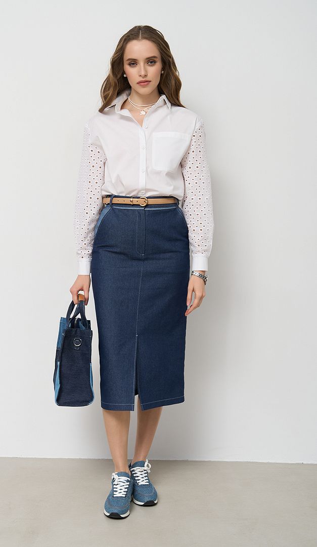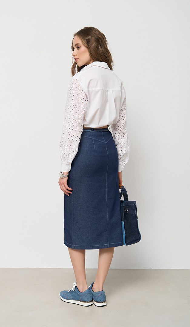 Для створення стильного луку радимо комбінувати спідницю з джинсовий жакетом (арт.2703), сорочкою бавовняною з ажурними рукавами (арт.2706) і базовою футболкою молочною (арт.1728).