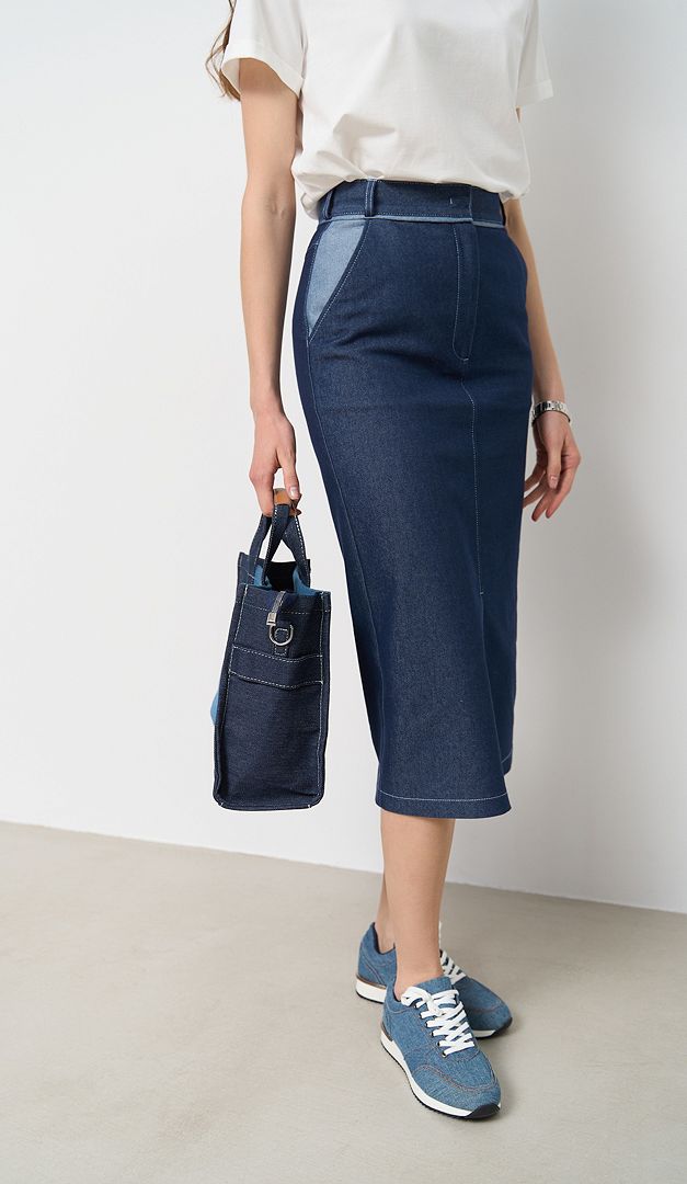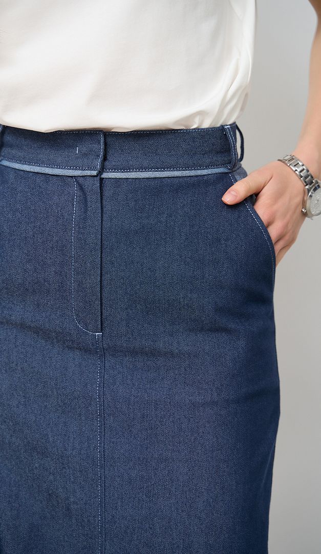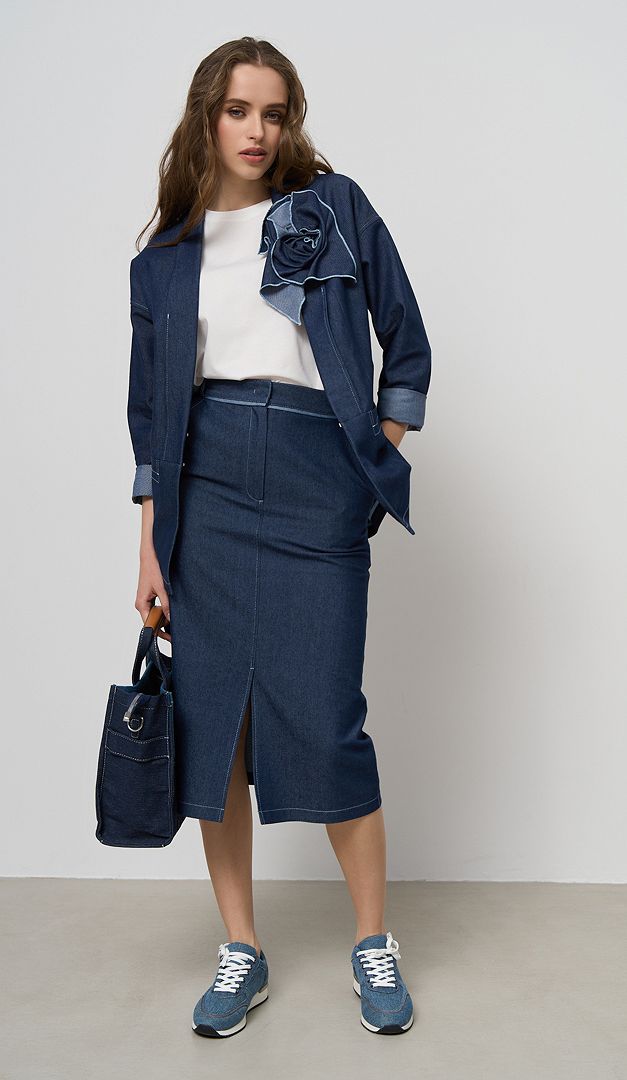 Спідниця джинсова пряма міді — універсальне рішення для стильних жіночих образів. Модель прямого крою, з елегантною довжиною міді і стильним високим розрізом по центру переду. Спідниця джинсова пряма міді має практичні прорізні кишені з боків та спереду застібається на один ґудзик і блискавку. Пояс виробу виконаний з функціональними петлями, завдяки яким образ можна доповнити ремінцем. Без підкладки.