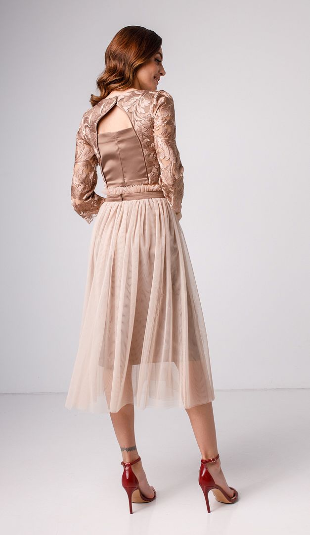 Прагнете створити жіночний святковий образ для корпоративу чи іншої особливої події? Спідниця фатинова бежева — ідеальне рішення для цього завдання. Модель складається із двох окремих виробів — атласної спідниці-олівець та об'ємної фатинової спідниці, які стильно поєднуються між собою, завдяки гармонійній комбінації кольорів та оригінальності текстури тканин. Верх атласної спідниці-олівець оформлений неширокою потайною м'якою резинкою і має практичну застібку-”блискавку” розташовану ззаду в середньому шві. Глибока шліца виробу додає спокусливих ноток жіночому силуету та практичності при ходьбі. Плісерована фатинова спідниця бежева зверху доповнена вузьким поясом із аналогічної атласної тканини та застібається на дві зручні кнопки. Саме цей елемент, завдяки своїй легкості на невимушеності дозволить вам створити неймовірно красивий та жіночний лук. Без додаткової підкладки.