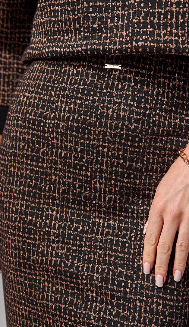 Оригінальна та ефектна спідниця олівець бронзовий принт стане базою для створення стильних жіночних образів! Модель виготовлена з еластичного трикотажного матеріалу, що забезпечує відчуття комфорту та зручності. Адже завдяки цьому, спідниця олівець бронзовий принт ідеально виглядає на всіх типах фігури. Виріб зверху оформлений широкою резинкою та має середню посадку по талії. Спідниця без застібок і підкладки.