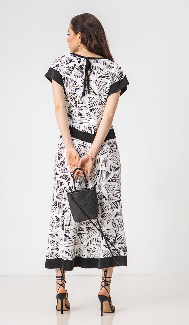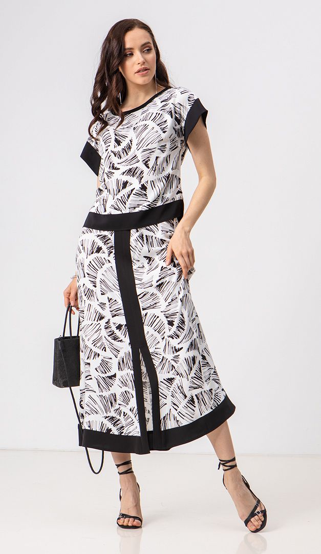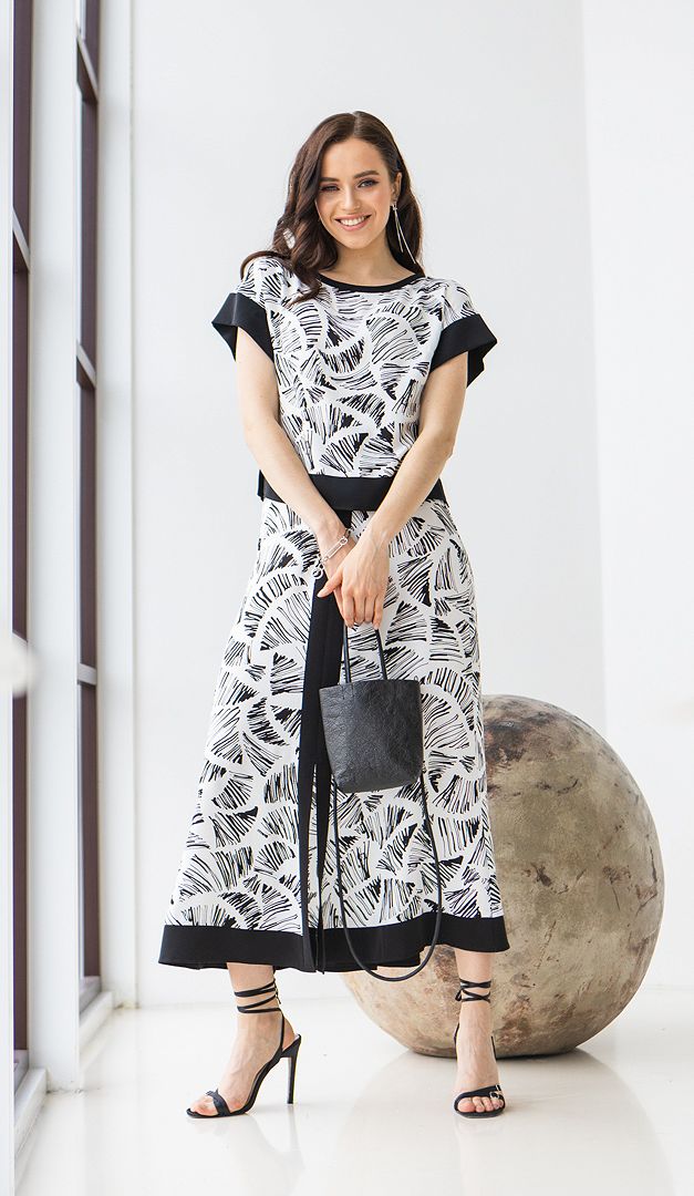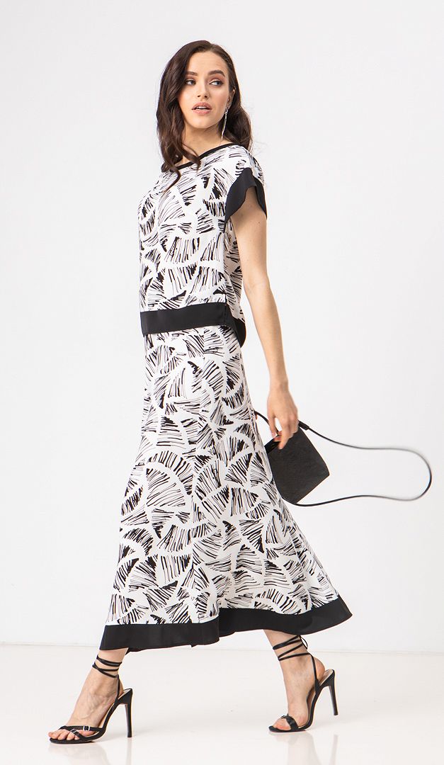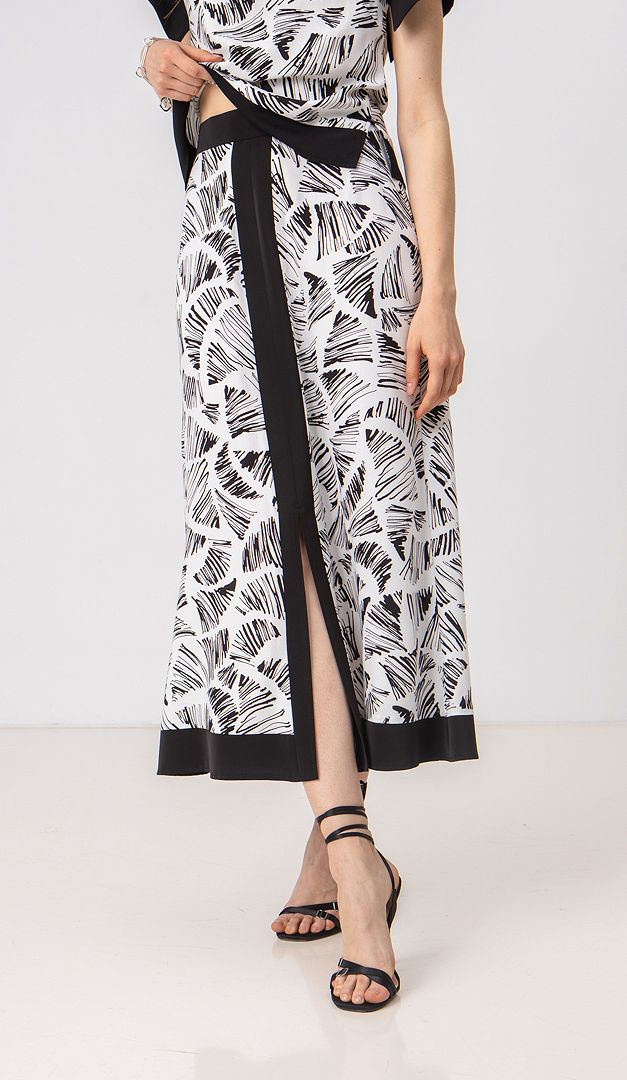 Для елегантного і в той же час розслабленого літнього образу рекомендуємо Вам спідницю міді білу з принтом! Спідниця має комфортний трапецієподібний крій і жіночну довжину міді. Посадка по талії — середня, з резинкою і застібкою «на блискавку» по спинці. Для контрастності, а також для зорового «витягування» силуету модель стильно доповнена контрастними планками. Ще одна кокетлива і практична деталь — це розпірка по центру переду спідниці, яка не обмежує ходьбу і грайливо відкриває лінію ніг. Спідниця без підкладки.